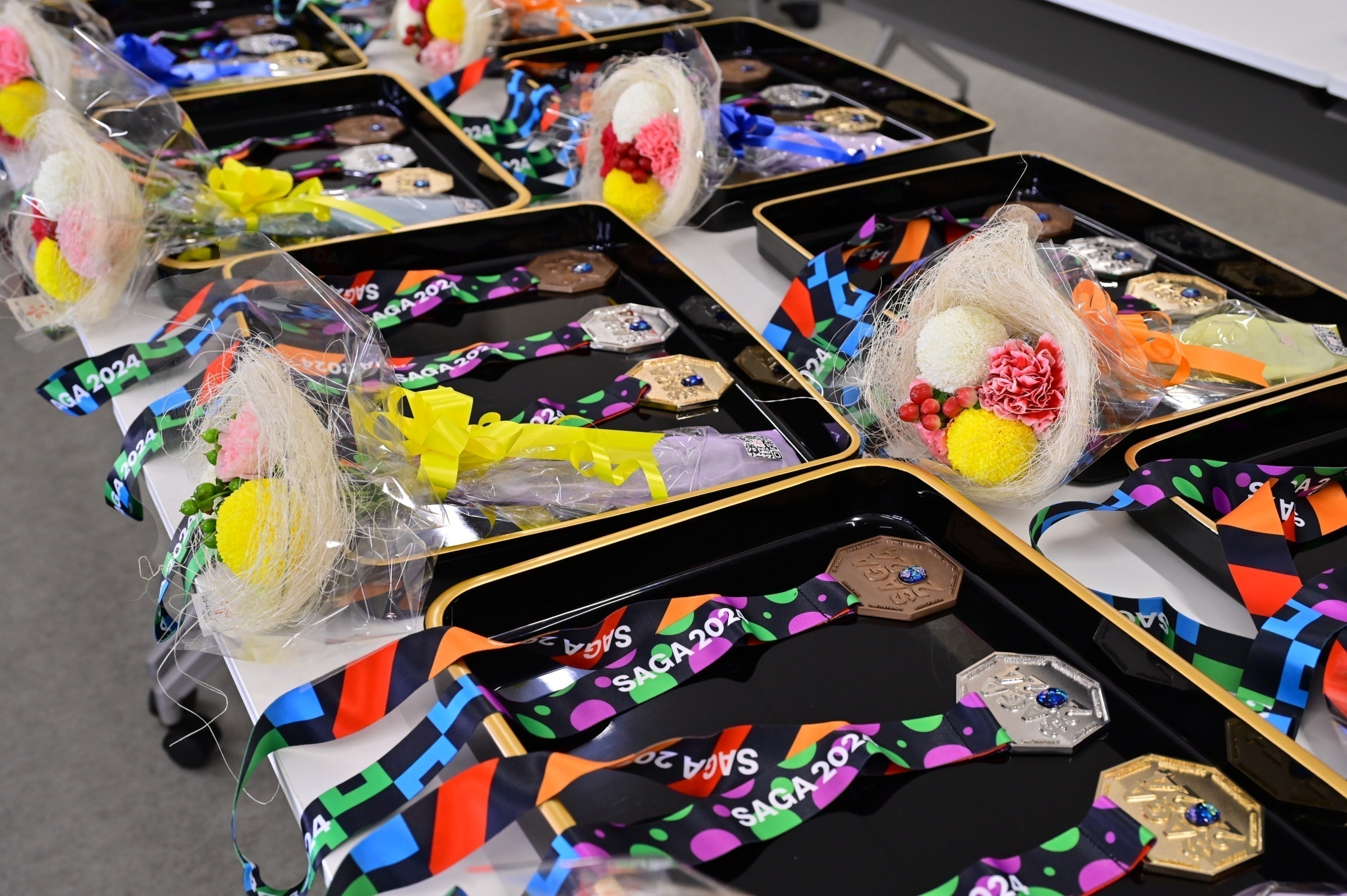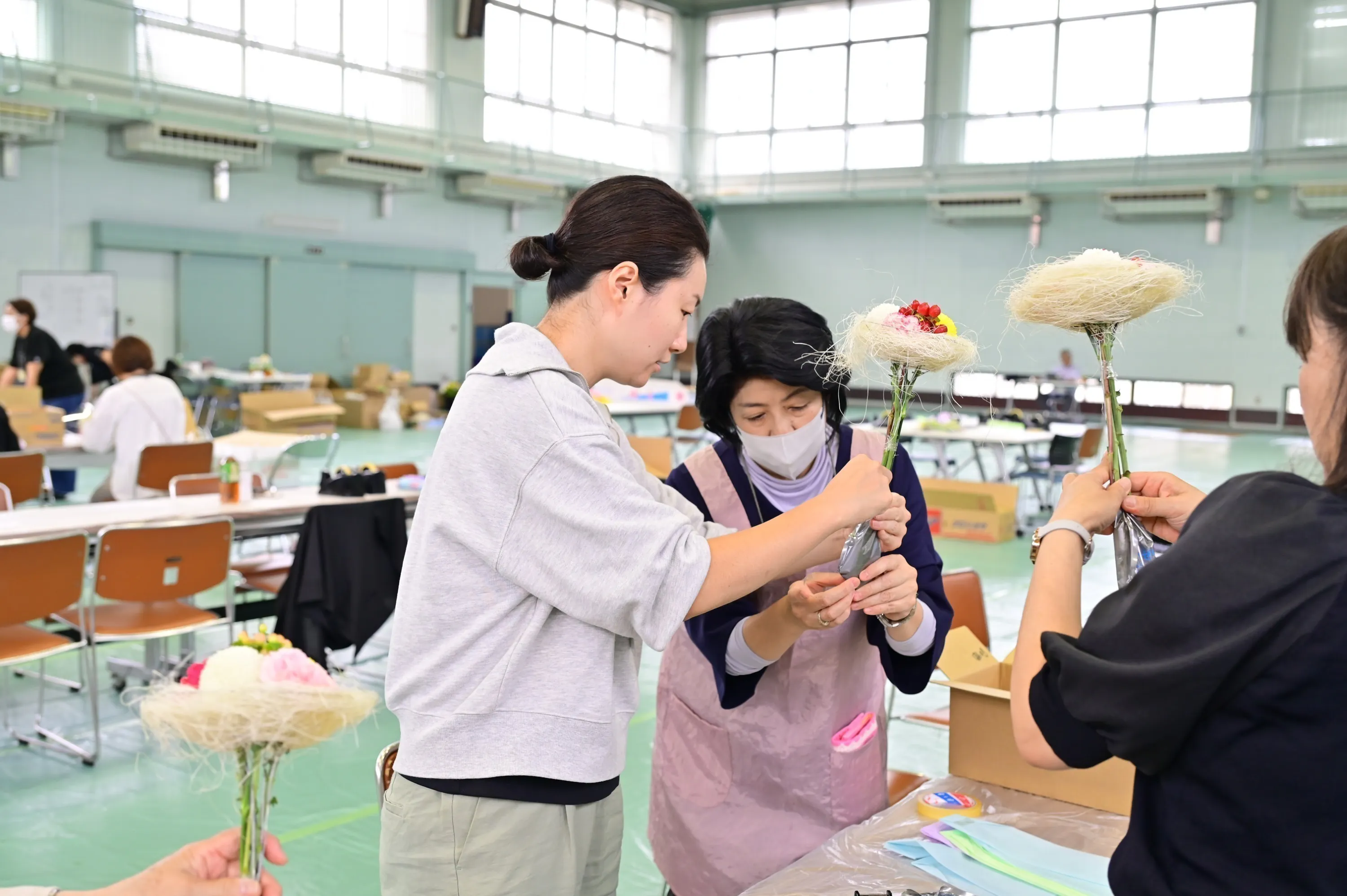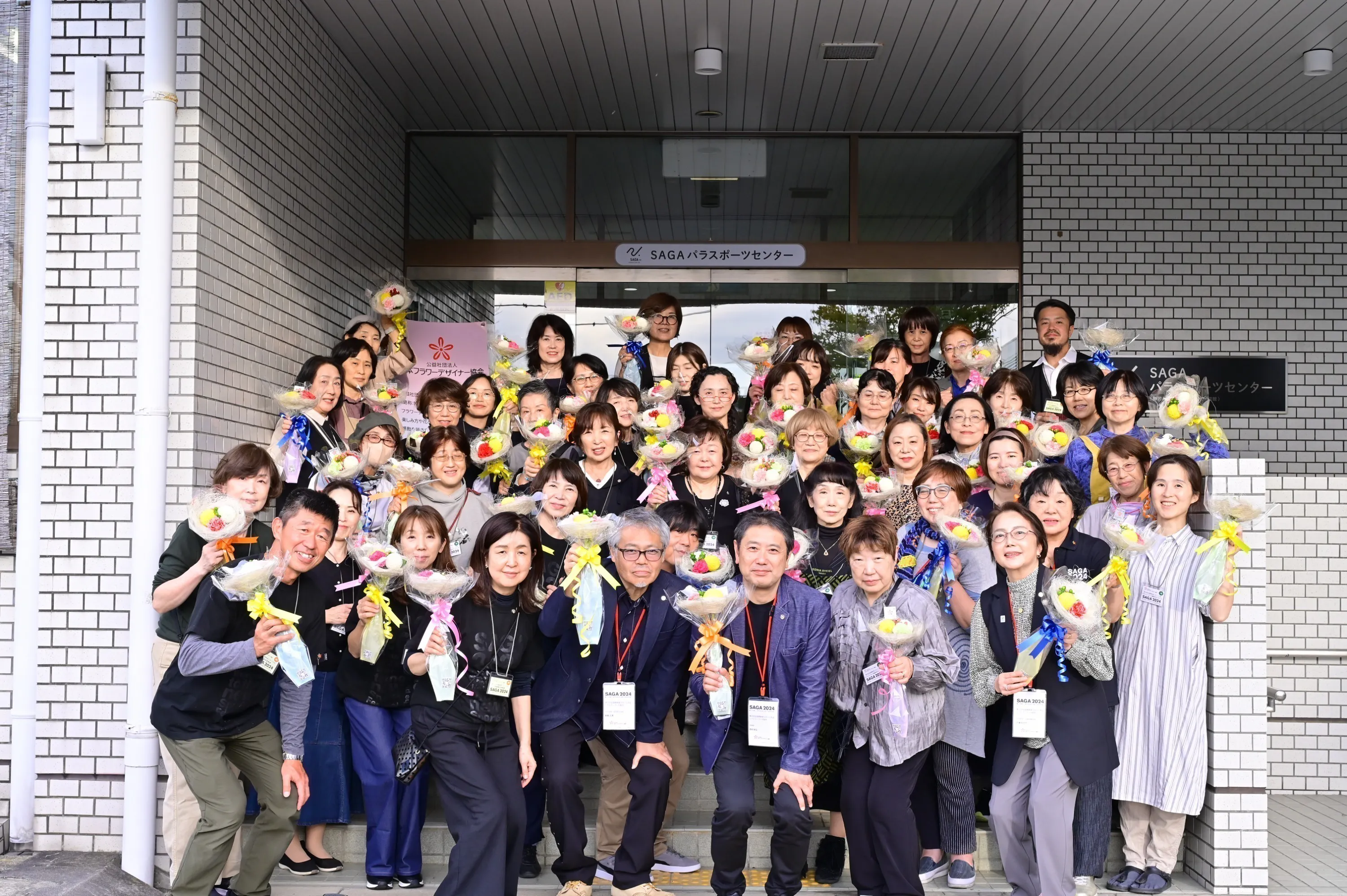 2025/12/24 13:18第24回全国障害者スポーツ大会「わたSHIGA輝く障スポ2025」ビクトリーブーケ贈呈が無事に終わりました。2025年10月25日(土)~27日(月)に開催された第24回全国障害者スポーツ大会「わたSHIGA輝く障スポ2025」。大会入賞者へのビクトリーブーケ贈呈を目的とした本プロジェクトが、皆様のご支援のおかげで無事に終了することができました。ご支援ありがとうございました。今年は、10月24日(金)からYMITアリーナ(くさつシティアリーナ/草津市)にて表彰者に贈るビクトリーブーケ 1,540束を 2日間かけて制作しました。制作1日目は 97名、2日目は 89名のボランティアが参加。その時の様子をご報告したいと思います。制作に備えて、準備開始制作前日、ビクトリーブーケ制作会場であるYMITアリーナの床に養生シートを敷いていきます。養生シートの上に机と椅子を配置し、ボランティアの皆さまが作業しやすいようにレイアウト。机には、透明なシートをかけていきます。水がこぼれたり、ハサミを使うので、床や机を汚したり傷つけたりしないようにするため、毎年、この準備からはじまります。養生シートを敷いたあとは、納品された花材を運び込んで種類ごとに並べます。使う花材は、カーネーションとピンポンマム。色とりどりの花は、見ているだけで心が躍ります。翌日に制作する数に合わせて、1つのバケツでビクトリーブーケが10束できるようにバケツにセットしていきます。バケツには番号を振って、どこまで制作したか分かりやすいように工夫しています。この準備は、当日をスムーズに進めるために、そしてたくさんのブーケを作るために、とても大事な工程のひとつです。日本フラワーデザイナー協会の滋賀県支部の支部委員を中心に、着々と準備が進められました。ボランティアを迎え、いよいよ制作開始制作は2日間かけて行われました。ボランティア数はなんとのべ186名。多くのボランティアスタッフが集まってくださいました。制作の前には、集まっていただいたボランティアスタッフへの挨拶からはじまり、続いて、ビクトリーブーケ制作のレクチャーを行いました。レクチャー終わると、各レーンごとに分かれて制作をはじめていきます。滋賀県支部委員を中心に、各レーンでは、丁寧に説明をしながらボランティアの様子を見守ります。最初は慣れていない様子で手を動かしていたボランティアスタッフも、徐々に慣れてくると楽しそうな笑顔を浮かべているのが印象的でした。制作2日間とも取材が入り、会場内も活気づいていました。そして、花材をセット組するエリアでは、翌日に制作するための準備作業を同時進行で行っています。前日準備と同じように、全体の制作数の管理がしやすくなるよう、1バケツにつきビクトリーブーケが10束制作できるようにセットしていきます。今年は一般の参加比率が全体の7割を超え、滋賀県と京都府の学校からボランティア体験として2校が参加。障害者スポーツ大会や、社会貢献に対する意識の高さをうかがえました。さて、各レーンでは、花を束ねるところからラッピングまでを3つの工程に分け、その他に、リボン作成、花袋へのシール貼り、茎を止めるときに使うステムティッシュを折る作業、ブーケの長い柄の部分を覆うためのローブシートを折る作業という4つの作業パートがあり、作業が偏らないよう、休憩ごとに場所を移動していきます。支部委員や運営スタッフも困っている人がいないか、ボランティアのそばで常にサポートしていました。制作2日目は、休憩時間にNFDのことについてや、どうしてフラワーデザイナーの道を歩んだのか?という紹介とあわせて、デモンストレーションを披露しました。ボランティアの皆さまが興味深そうにデモンストレーションの様子を眺めたり、完成した作品を撮影したりと楽しんでいる様子でした。その間にも、完成したビクトリーブーケは大事に箱に詰められ、各会場へと運ばれていきます。午前と午後の最後には、自分たちの作ったビクトリーブーケを手にして、笑顔で記念撮影。自分の作ったビクトリーブーケが選手の手に渡ることを楽しみにしつつ、手にしたビクトリーブーケも大事に箱詰めして、その想いとともに競技会会場へと届けられました。競技会場で見たビクトリーブーケ全国障害者スポーツ大会2日目である10月26日。「わたSHIGA輝く障スポ2025」の取材のため、滋賀県彦根市にある陸上競技場「平和堂HATOスタジアム」を訪問しました。当日はあいにくの雨でしたが、ボランティアの方が心を込めて制作したビクトリーブーケ。無事に会場へと届けられ、メダルとともに、雨にも負けず奮闘した1位の選手のもとへ運ばれます。その喜びあふれる姿をお届けします。手にしたビクトリーブーケによって、栄冠を勝ち取った競技者をより一層華やかに彩り、栄誉を称えます。ビクトリーブーケを掲げながら、とびきりの笑顔で喜ぶ姿をたくさん見ることができました。最後に今大会より、制作をボラ
