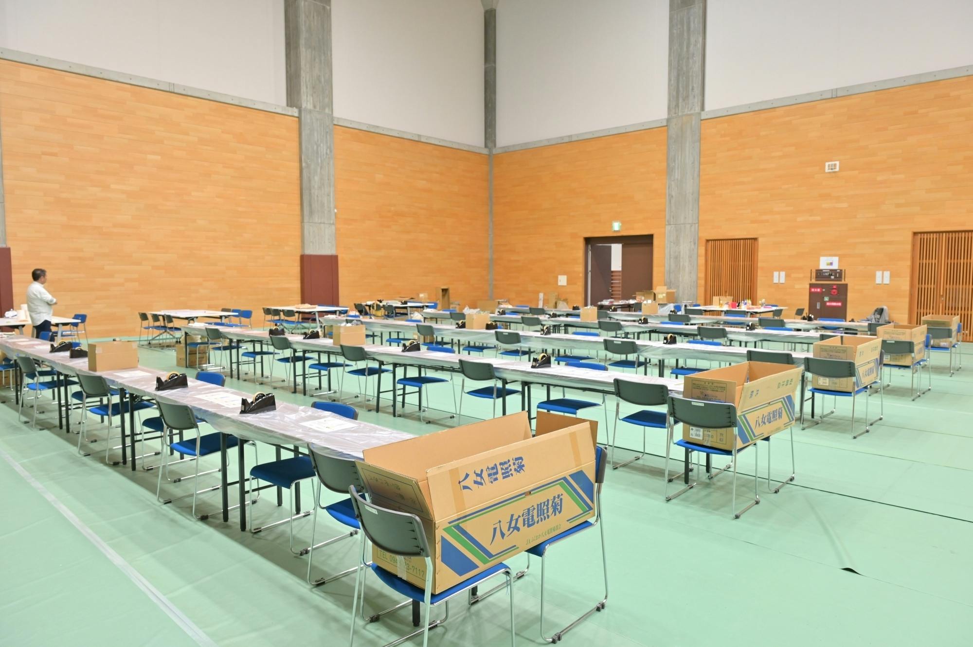 制作前日、ビクトリーブーケ制作会場であるYMITアリーナの床に養生シートを敷いていきます。養生シートの上に机と椅子を配置し、ボランティアの皆さまが作業しやすいようにレイアウト。机には、透明なシートをかけていきます。水がこぼれたり、ハサミを使うので、床や机を汚したり傷つけたりしないようにするため、毎年、この準備からはじまります。