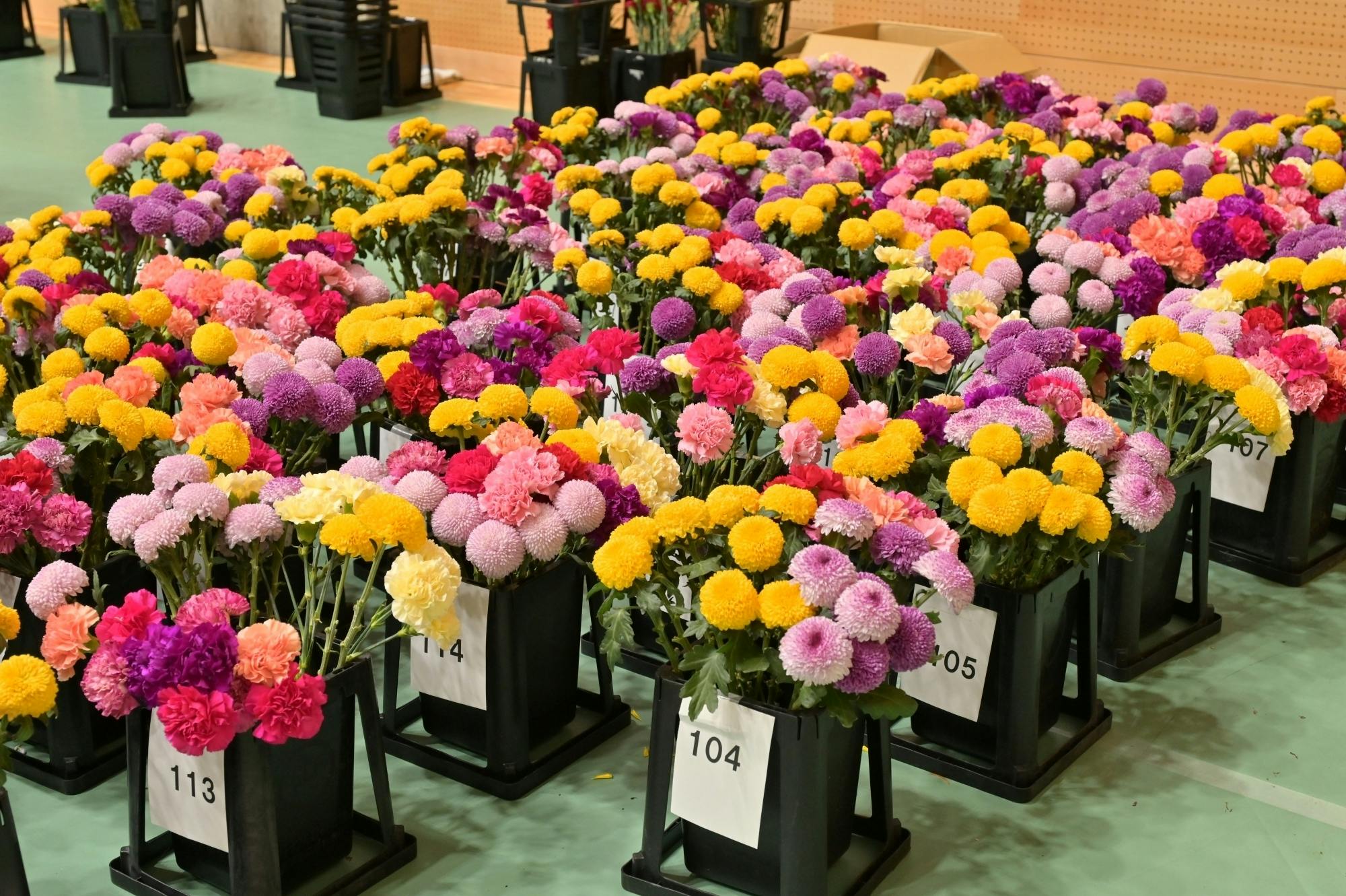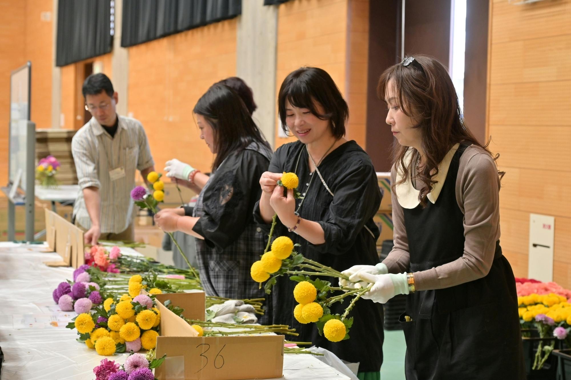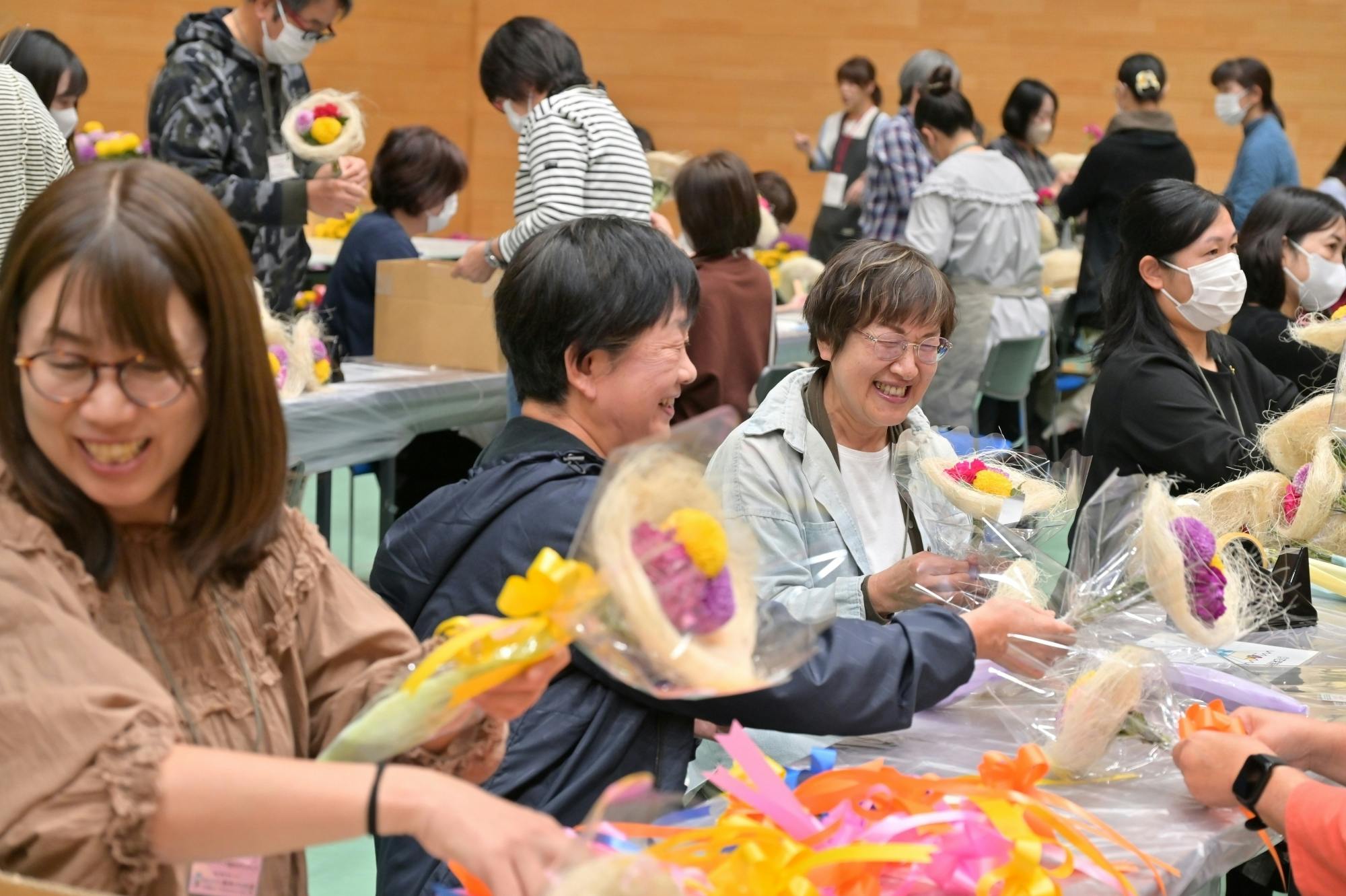 今年は、10月24日(金)からYMITアリーナ(くさつシティアリーナ/草津市)にて表彰者に贈るビクトリーブーケ 1,540束を 2日間かけて制作しました。制作1日目は 97名、2日目は 89名のボランティアが参加。