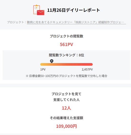 「映画ジストニア」クラファン昨日のページ閲覧数が“過去最高”になりました。難病のドキュメンタリーは、どうしても広がりにくい分野で、特に日本では、こうした活動が正当に評価される土壌がまだ十分ではないと感じています。そんな中で今回、個人発信の映画のクラファンに“初めまして”の方々が次々と参加してくださっています。その広がりが数字として見えはじめたことで、これまでなかなか関心を持たれにくかった難病を周知するドキュメンタリー映画に対して、社会が「あれ…? 何が起きてるんだろう?」と振り向きはじめているのを実感しています。10数年、自主製作として作り続けてきた「映画ジストニアシリーズ」に対して、心のどこかで「社会に大きな影響なんて与えられないだろうな」と諦めの気持ちがあったのも事実です。でも今回、皆さんからのご支援・ご協力を通して、「いけるよ!変えられる!」「自信を持て、頑張れ!」と背中を押していただき、単純な僕は「そっか。行けるな!」とコロっと考えが変わりました。分かりやすく言えば「自信」が持てました。これは、完全に皆さんのおかげです。 クラファン終了まで、あと37時間。ネクストゴールまで、残り45万5千円。今起こりつつある関心・興味のムーブメントの広がりに、僕は強い「希望」を感じています。このラストスパートで、さらに多くの人へ届けば、このムーブメントは間違いなく、もっと大きくなるはずです。 残りわずかの時間、どうか最後の一押しに力をお貸しください。シェアでも、ひとことの紹介でも、本当に力になります。一緒に、社会を動かしましょう。一人では重くても、力を合わせれば確かに動く——今回、そのことを深く実感しています。