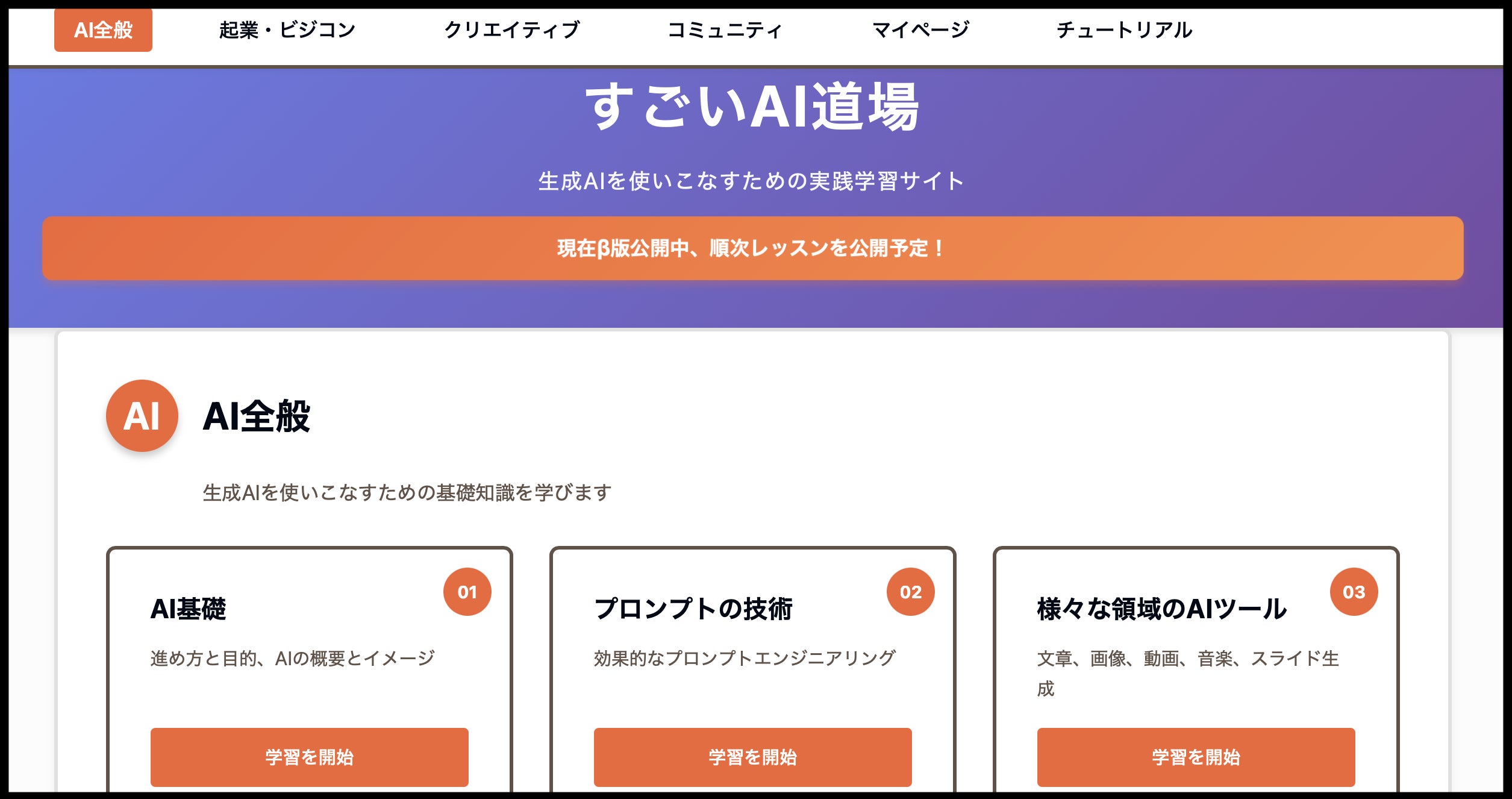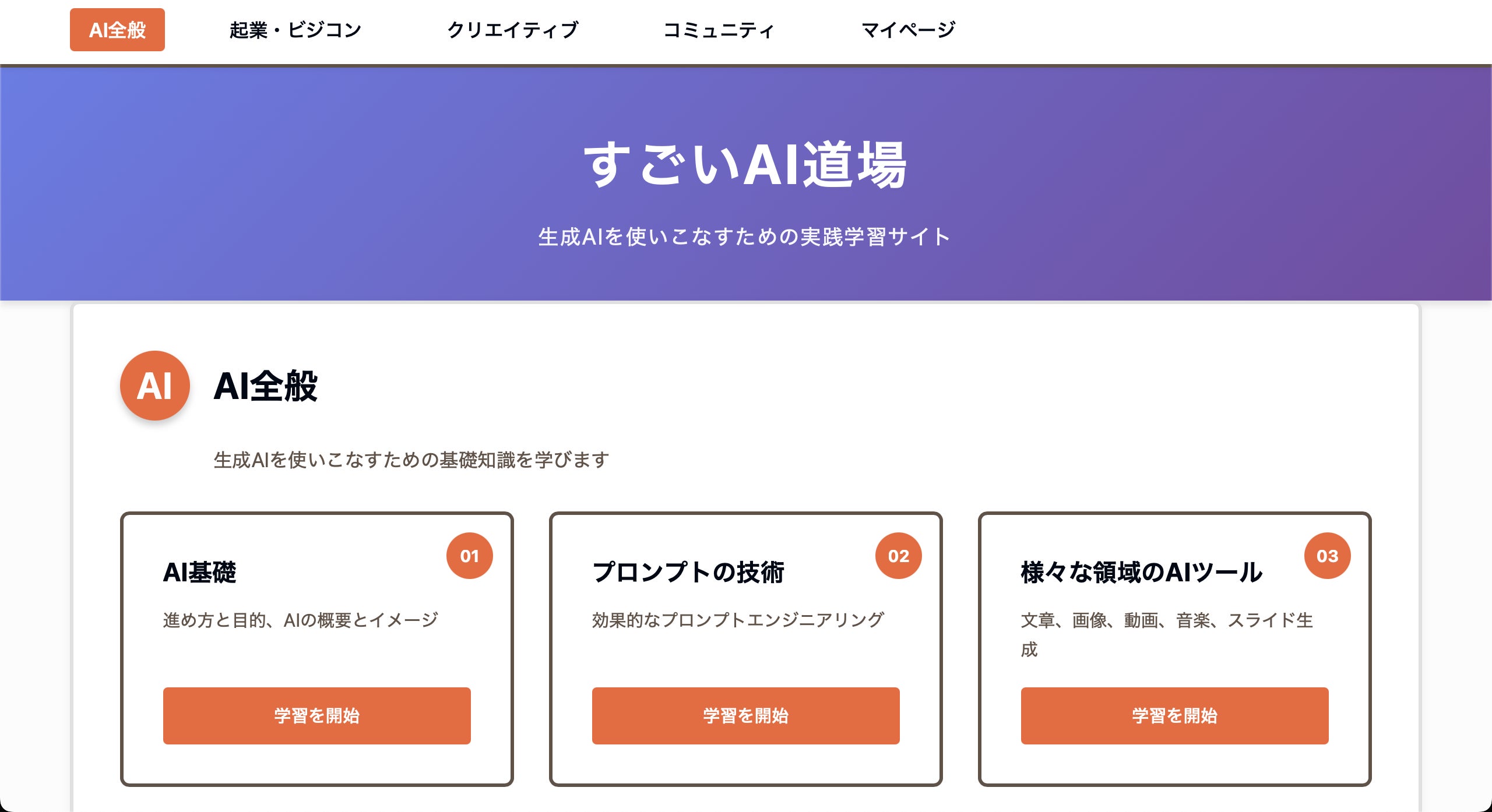 まずは、誰もがAIを体系的に学べるウェブサイト「すごいAI道場」を立ち上げます。AI活用をゼロから学べる、オンラインAI学習サイトです。