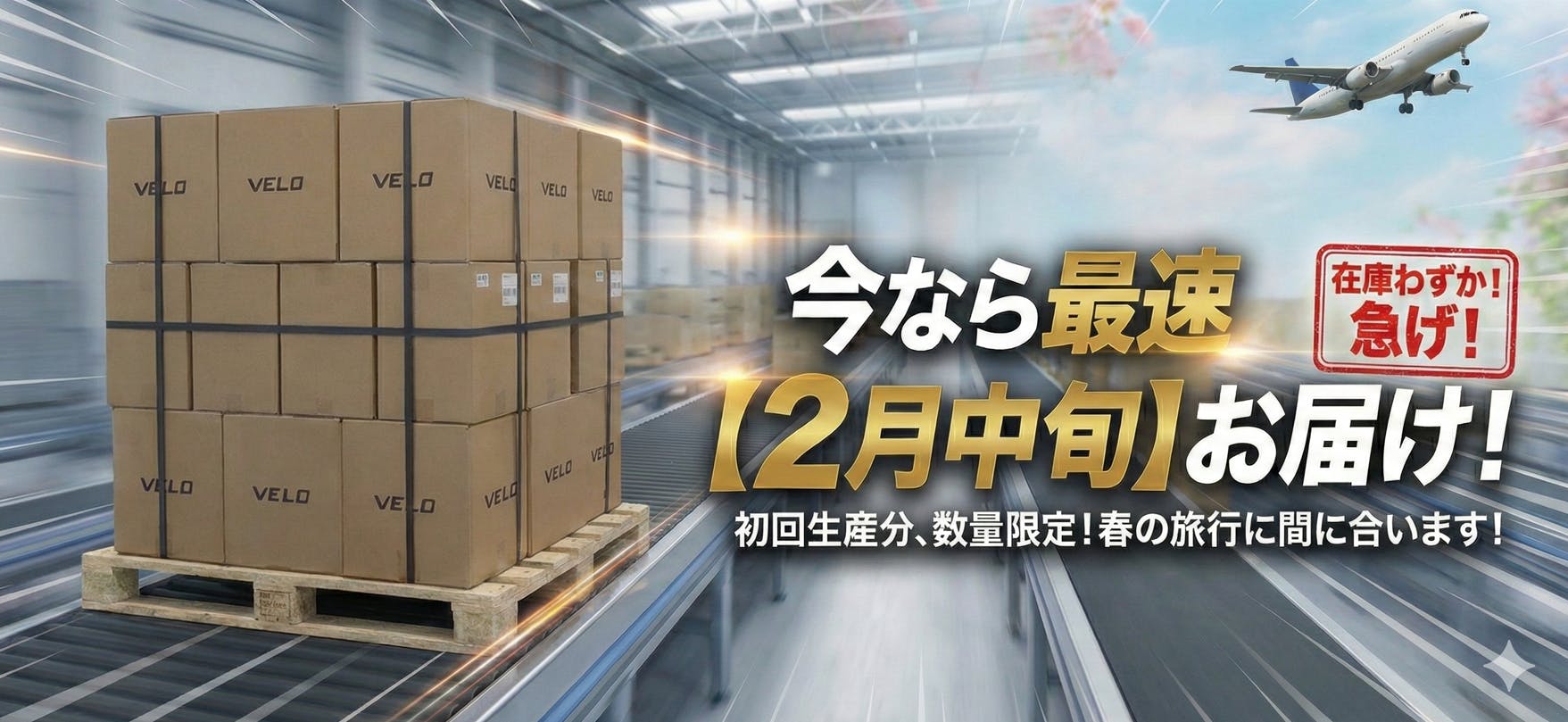 2026/01/27 22:56サポーターの皆様、こんにちは! VELO JAPANです。本日は、皆様が一番待ち望んでいた「生産状況」と「配送時期」について、とっておきのビッグニュースをお届けします!工場より、VELOの「初回生産分」の製造・検品・梱包がすべて完了したとの報告が入りました! まずは、出荷待ちの山積みになったVELOをご覧ください。■ 「超早割」の方は【2月中旬】にお届け!お待たせいたしました! 現在の輸送スケジュールが順調に進めば、「超早割」でご支援いただいた皆様には、【2月中旬】より順次お届けを開始できる見込みです! 一般的なクラウドファンディングでは「忘れた頃に届く」ことも多いですが、 VELOは**「春の旅行シーズンに間に合わせたい!」**という強い想いで、異例のスピード配送を実現します。到着まであと少しです。ぜひ楽しみにお待ちください!■ ⚠ まだ支援されていない方へ(重要なお知らせ)「今から買っても、届くのはずっと先なんでしょ?」 そう思っている方、いいえ、違います!今回確保した「初回生産分」には、まだ若干の余裕がございます。 つまり……「今」ご支援(ご購入)いただければ、皆様も【2月中に】VELOを受け取ることが可能です!春休みの旅行や、3月の連休の予定にもバッチリ間に合います。ただし、ご注意ください。この「初回生産分(即納分)」の在庫がなくなり次第、次は「第2期生産分(数ヶ月後のお届け)」となってしまいます。「早く手に入れたい!」 「春の旅行に使いたい!」という方は、在庫がある今のうちに、大急ぎで確保してください!■ ご友人やご家族も誘うなら「今」がチャンス!「2月に届くなら、一緒に旅行に行こうよ!」 そんな風に、旅好きのご友人やご家族を誘ってみてはいかがでしょうか?■ 現在配布中の**「10%OFFクーポン(1/31まで)」を使えば、 お知り合いの方も【お得に】、そして【スピーディーに】**VELOを手に入れられます。↓ シェア用:10%OFFクーポン付きリンク[ https://camp-fire.jp/projects/892267/view?ctoken=xVytpbUUGdQm4tSE ]2月に皆様のお手元にVELOをお届けできることを、チーム一同楽しみにしております! 引き続き、応援よろしくお願いいたします! VELO JAPAN もっと見る