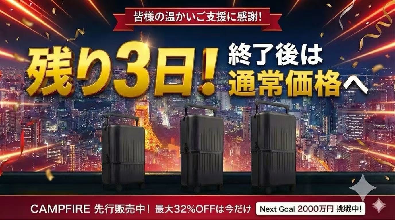 あと3日。泣いても笑ってもこれが最後です。 皆様の周りに、旅行や出張の荷物で悩んでいる方、スーツケースの買い替えを検討している方はいらっしゃいませんか?