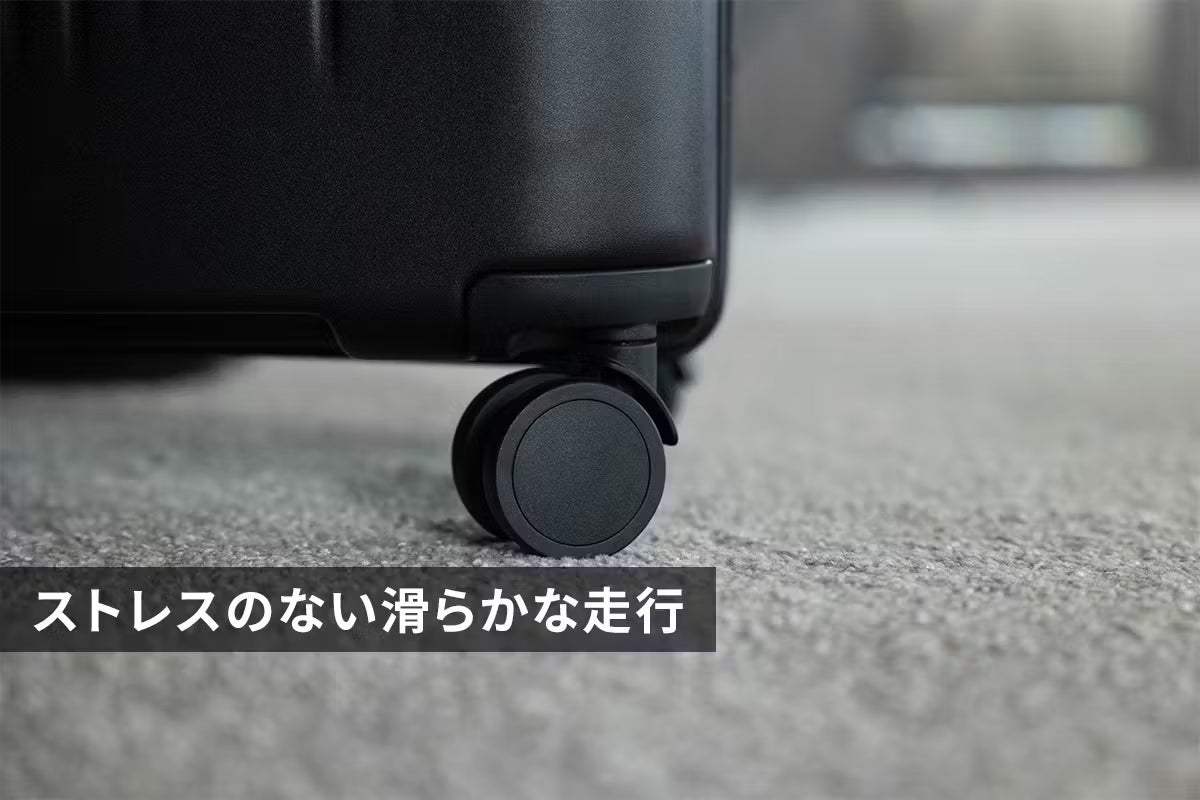スーツケースの命とも言えるキャスター部分をアップグレードしました。ホイールの支柱(ブラケット)を大型化し、全体の高さも調整。これにより耐荷重性能が大幅にアップしました。重量のある荷物を入れた際も沈み込みにくく、より滑らかで静かな走行を実現しています。