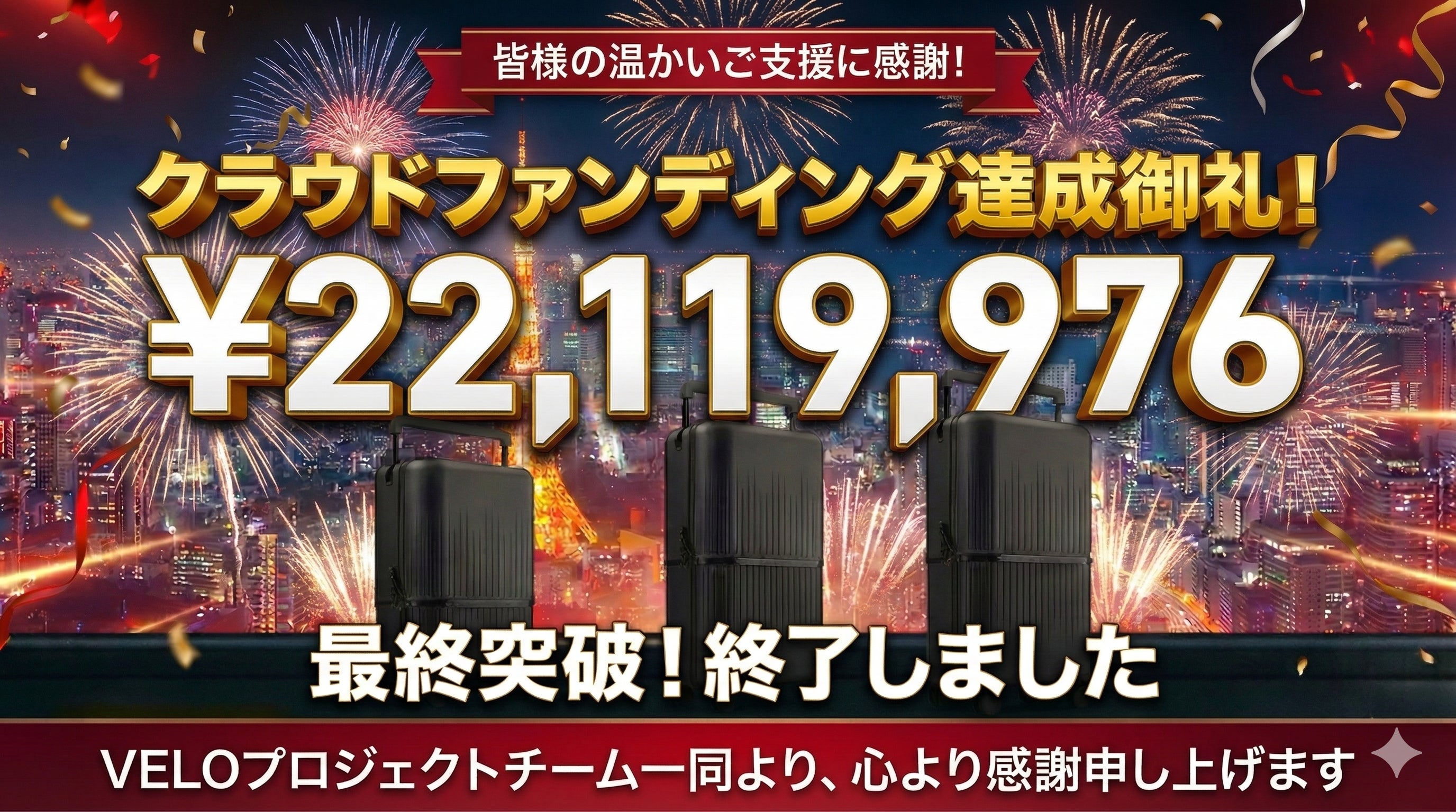2026/03/05 22:30サポーターの皆様 VELOプロジェクトチームです。VELOのクラウドファンディングプロジェクトが、無事に終了いたしました。 最終的なご支援総額は……【 22,119,976円 】目標を大きく上回る、驚異的な結果で幕を閉じることができました。 このプロジェクトを支えてくださった全てのサポーターの皆様に、チーム一同、心より深く感謝申し上げます。本当にありがとうございました!【今後の配送スケジュールについて】皆様が心待ちにされているお届け状況について、改めてご報告させていただきます。2月12日までにご支援いただいた皆様:2月28日までに全ての発送作業が完了しております。到着まで今しばらくお待ちください。2月12日以降にご支援いただいた皆様:現在、工場の生産を最大限に督促しております。春節の影響で一部遅延が生じておりご迷惑をおかけしますが、**「3月5日」**までには皆様のお手元にお届けできる見込みです。一日も早く、VELOという新しい旅の相棒をお届けできるよう、最後まで責任を持って対応させていただきます。【これからのVELOについて】プロジェクトは一度終了しますが、これはVELOにとっての「始まり」に過ぎません。これから皆様の旅や出張が、VELOによってより快適で自由なものになることを願っております。個別の配送に関するお問い合わせは、引き続きメッセージにて承っております。 今後とも、VELOをどうぞよろしくお願いいたします!VELOプロジェクトチーム もっと見る【重要】配送スケジュールおよび一部遅延に関するお詫びとお知らせ!