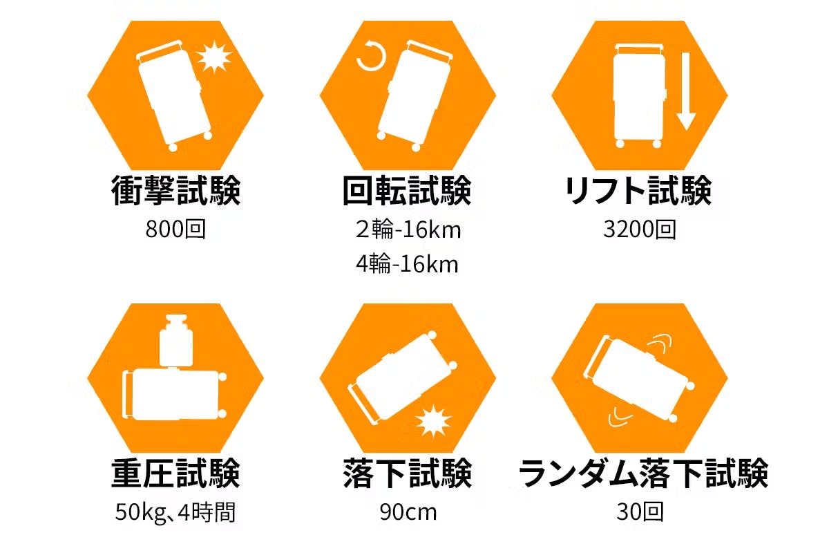 【世界基準の品質証明】台湾国家規格「CNS 1533」を完全クリア。落下、荷重、伸縮、走行(キャスター耐久)、さらには化学的特性試験まで。 世界的に厳しいとされる台湾の国家基準「CNS 1533」における、過酷な検査項目をすべて突破しました。 単なる「丈夫そう」ではなく、データと実績に裏付けられた「確かな信頼」を、あなたの旅にお届けします。
