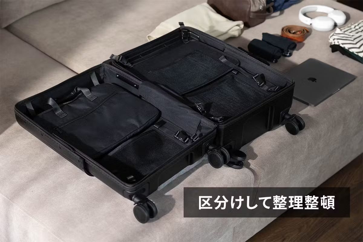 サイズ可変式・専用ディバイダー。ケースの伸縮に合わせて位置調整が可能な、専用の仕切り板(ディバイダー)を両面に標準装備。 容量を変えても荷物をしっかりとホールドするため、移動中でも中身が乱雑になりません。 付属のファスナー付きポケットは、パスポートや貴重品の管理に最適。どこに何があるか一目で分かり、旅の快適性を高めます。