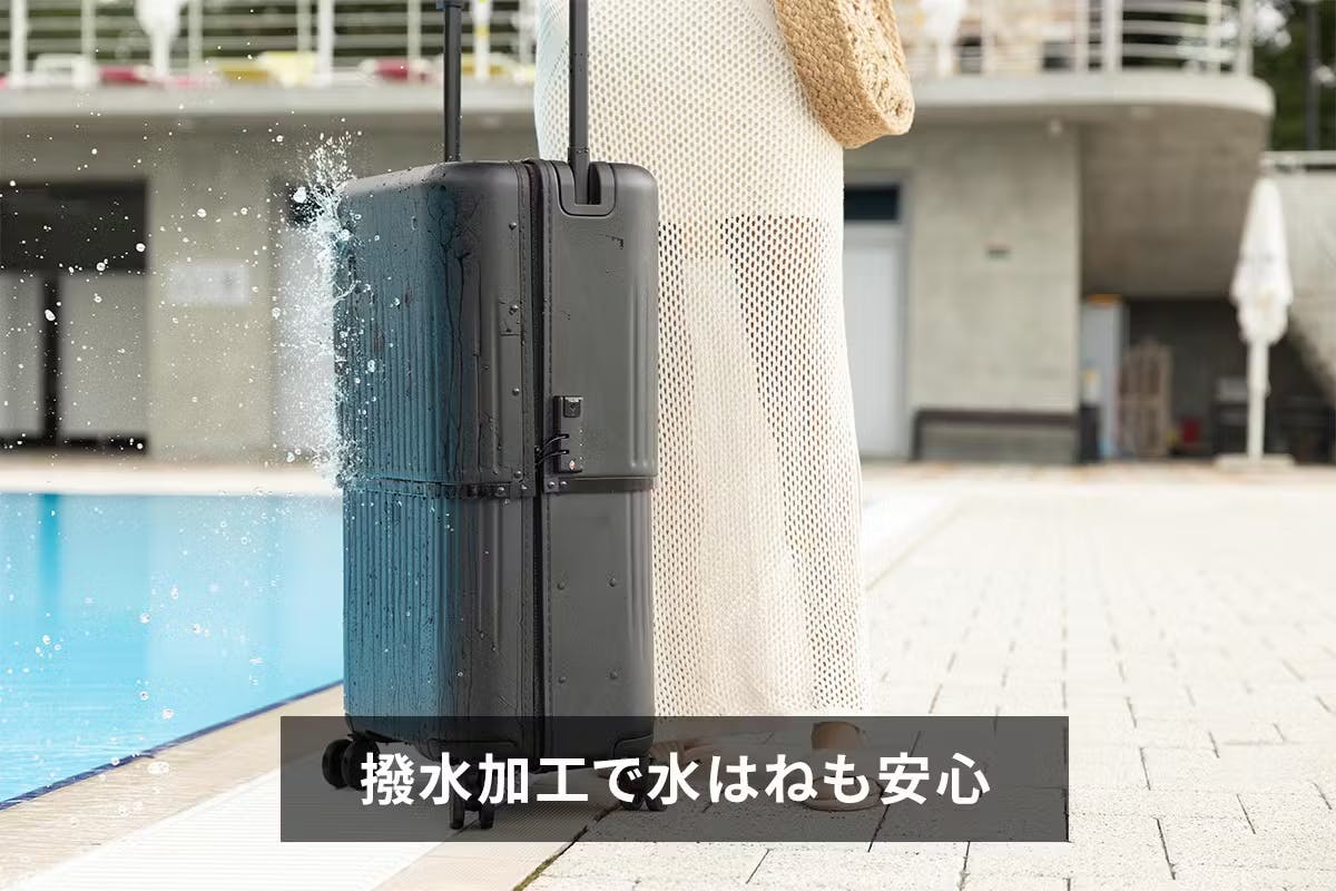 全面撥水コーティング。ボディ全体に施された高度な撥水加工が、水滴や泥ハネを強力に弾きます。 旅先での急な悪天候でも慌てる必要はありません。汚れが付着してもサッと拭き取るだけで、スーツケースの美しさを保てます。