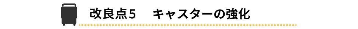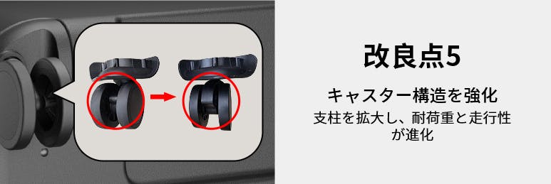 スーツケースの命とも言えるキャスター部分をアップグレードしました。ホイールの支柱(ブラケット)を大型化し、全体の高さも調整。これにより耐荷重性能が大幅にアップしました。重量のある荷物を入れた際も沈み込みにくく、より滑らかで静かな走行を実現しています。
