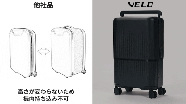 家に1台、VELOがあればいい。どんな旅にもフィットする変幻自在のボディが、あなたの移動を劇的に自由にします。 弾丸旅行も、ロングステイも。どこに行く時も、常に最適なサイズであなたに寄り添う、唯一無二のスーツケースです。