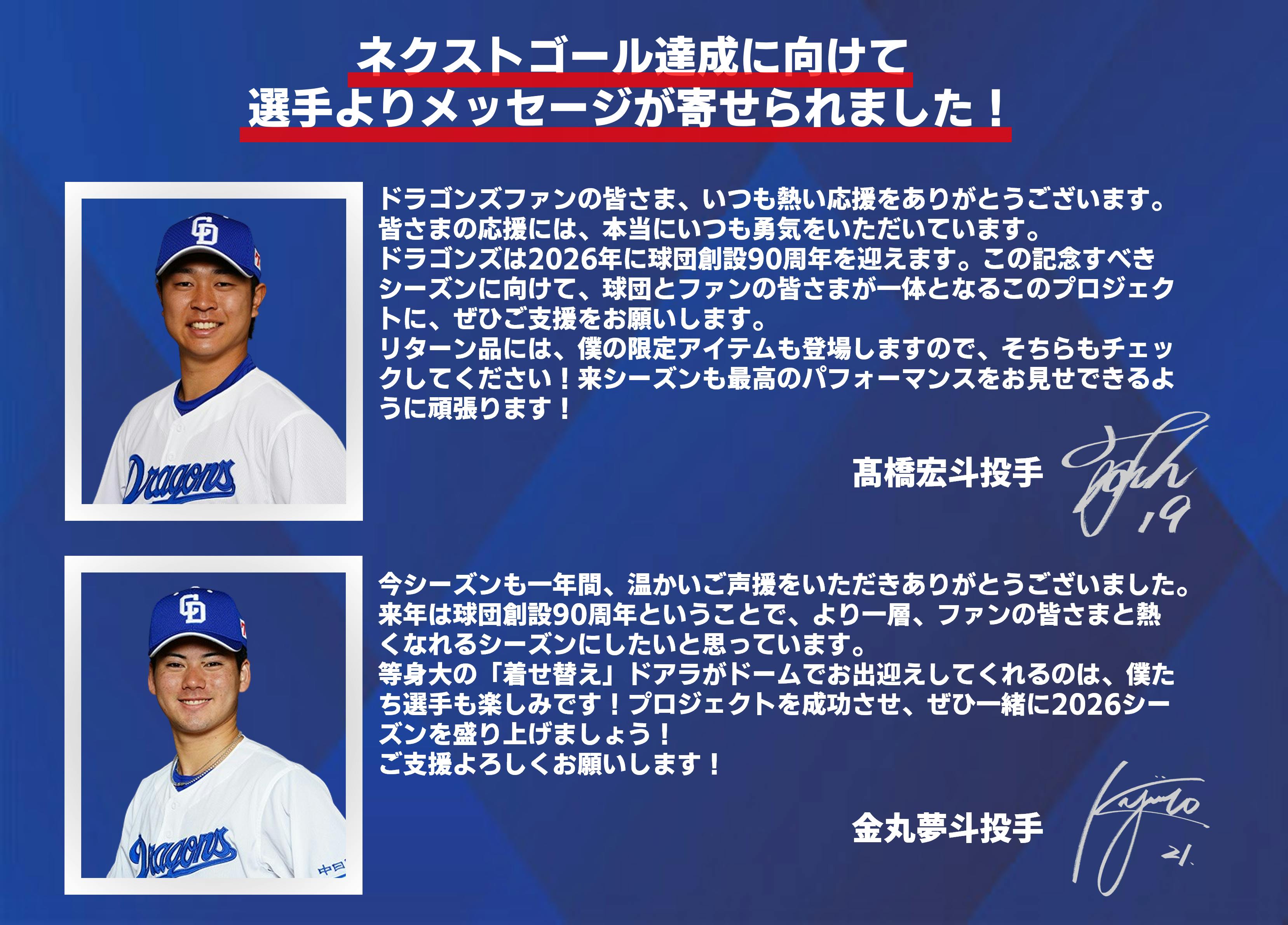 2025/11/22 20:30本日11月22日(土)、バンテリンドーム ナゴヤにて開催された「中日ドラゴンズ ファンフェスタ2025」にて、2026年シーズンに監督・選手等が着用する3種類のユニホームのデザインが発表されました!※ホーム(モデル:金丸投手)、ビジター(モデル:石伊選手)、FC限定(モデル:吉田投手)詳細はコチラから当クラファンのリターン品についても、このユニホームデザインをもとに製作してまいります。今後、追加のプロジェクトゴールやオリジナルリターン品も鋭意準備中です!いよいよ発表された90周年のメモリアルイヤーを戦うユニホーム。ますます期待感が高まってきました!!引き続きご支援の程、よろしくお願いいたします。当プロジェクト担当スタッフ一同 もっと見る多くのご支援ありがとうございます!