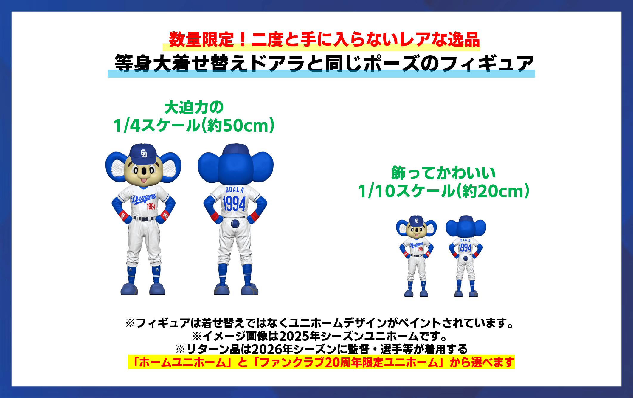 2026年シーズンのホームゲームユニホームに加え、FCスペシャルゲームで着用するファンクラブ20周年限定ユニホーム、昇竜デーに着用する昇竜ユニホームなど、その日の試合で監督、選手等が着用するユニホームに"お着替え"した等身大ドアラモニュメントが、バンテリンドーム ナゴヤに来場されるファンの皆様をお迎えします。腕も複数パターンの型を用意し、いろいろなポーズに変身!バンテリンドーム ナゴヤで観戦いただく際の新たなフォトスポット、交流の場となければ幸いです。
