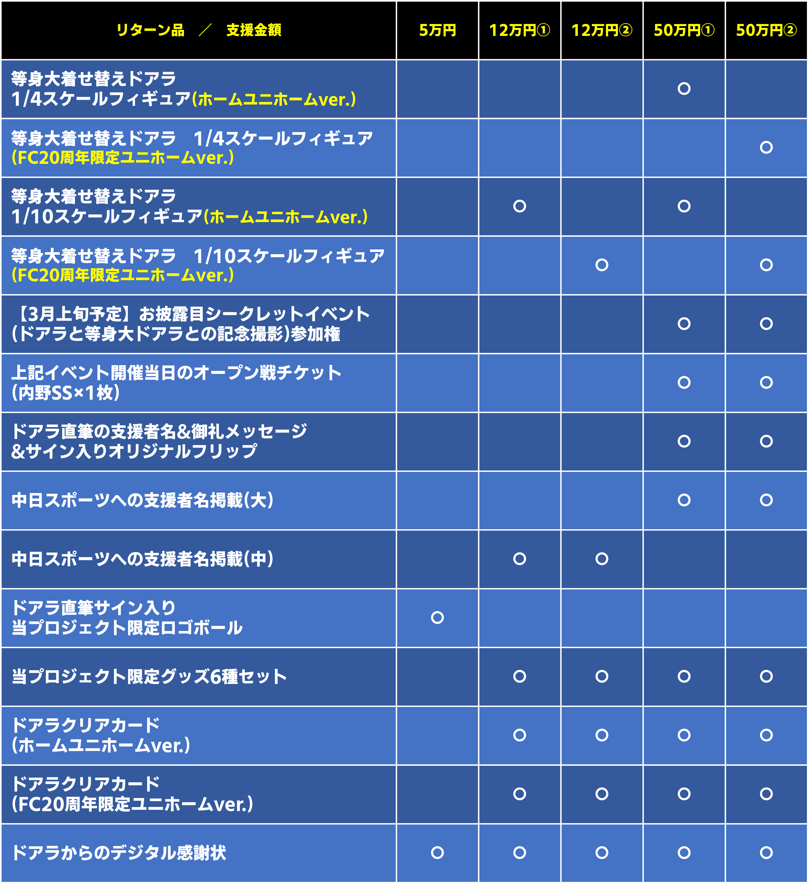 ユニホームのシワまで忠実に再現した1/4スケールのフィギュアなど全部のリターン品や、ドアラとの記念撮影など特別イベントを盛り込んだ50万円プランから、お手軽に支援していただける1994円のプランまで、すべてのドラゴンズファンの皆様に支援していただけるようプランを充実させました。