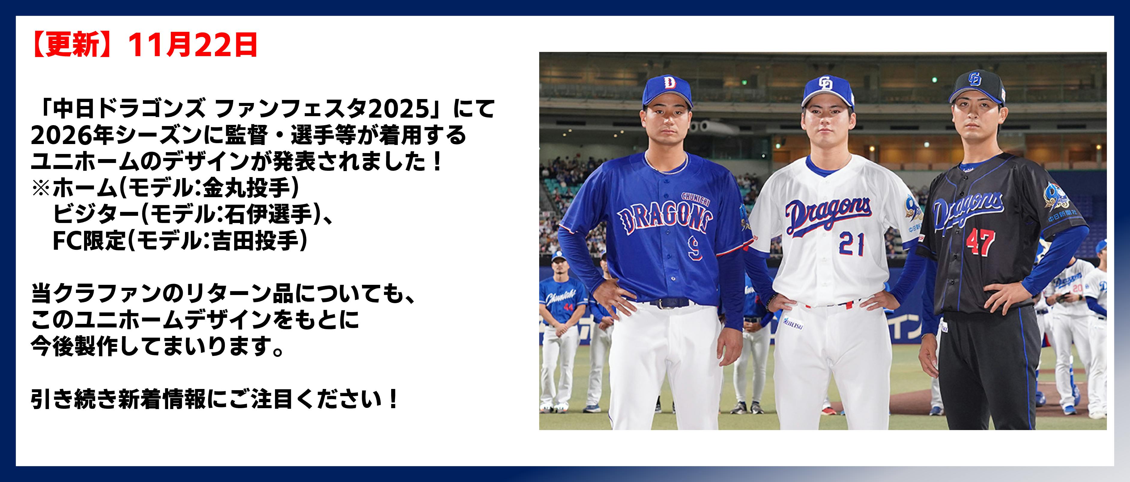 2025/11/22 20:30本日11月22日(土)、バンテリンドーム ナゴヤにて開催された「中日ドラゴンズ ファンフェスタ2025」にて、2026年シーズンに監督・選手等が着用する3種類のユニホームのデザインが発表されました!※ホーム(モデル:金丸投手)、ビジター(モデル:石伊選手)、FC限定(モデル:吉田投手)詳細はコチラから当クラファンのリターン品についても、このユニホームデザインをもとに製作してまいります。今後、追加のプロジェクトゴールやオリジナルリターン品も鋭意準備中です!いよいよ発表された90周年のメモリアルイヤーを戦うユニホーム。ますます期待感が高まってきました!!引き続きご支援の程、よろしくお願いいたします。当プロジェクト担当スタッフ一同 もっと見る多くのご支援ありがとうございます!