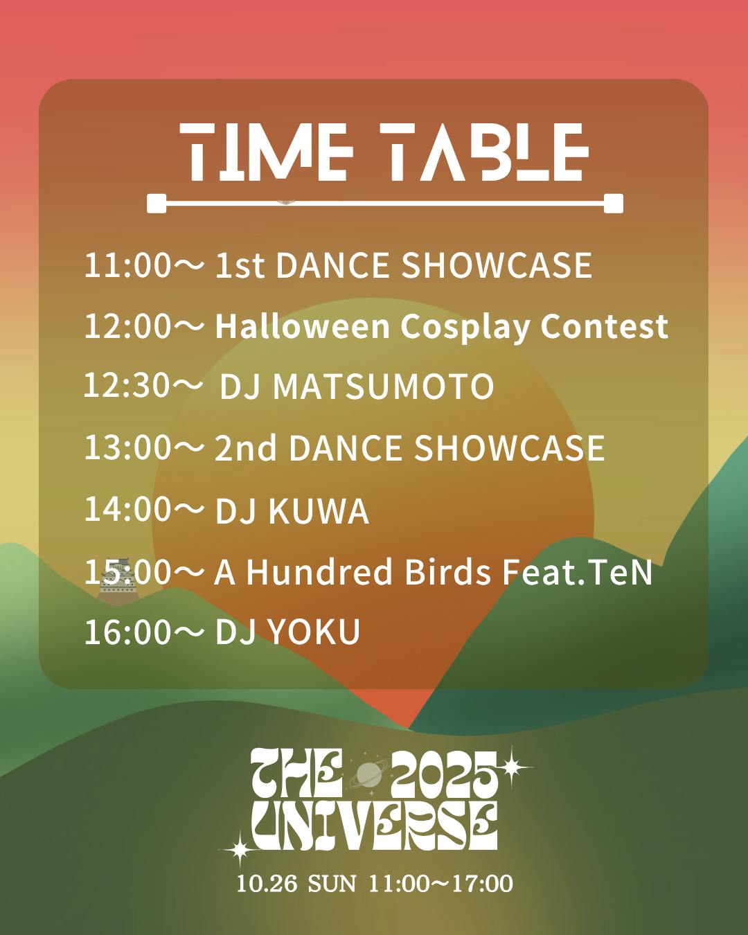 2025/10/18 20:26いよいよ来週となりました!こちらはタイムテーブルです^^気持ちのいい音楽とダンスと仲間があって、、ただそれだけが最高だなって思える休日をお届けできるよう残りの準備もしてまいりますm(_ _)mご支援くださり、本当にありがとうございます。心より感謝申し上げます。Kury もっと見る