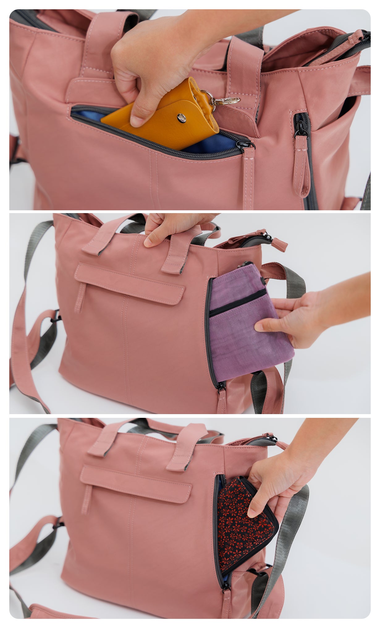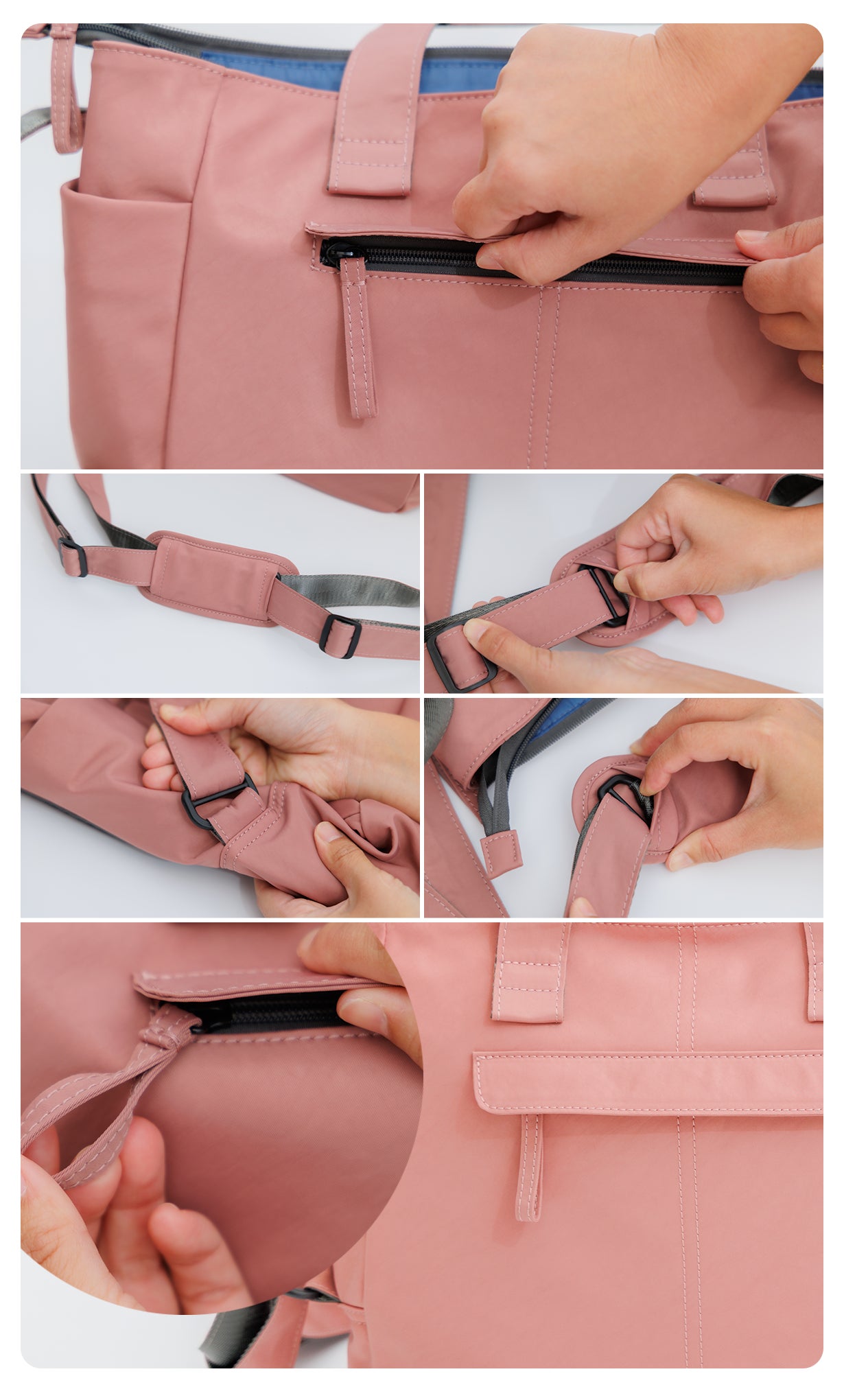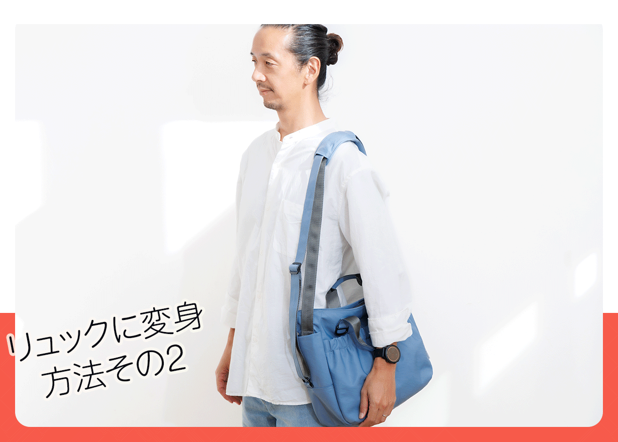 普段斜め掛けではなく、片方の肩にかけることが多い方なら、肩にかけたままでもリュックにできます。