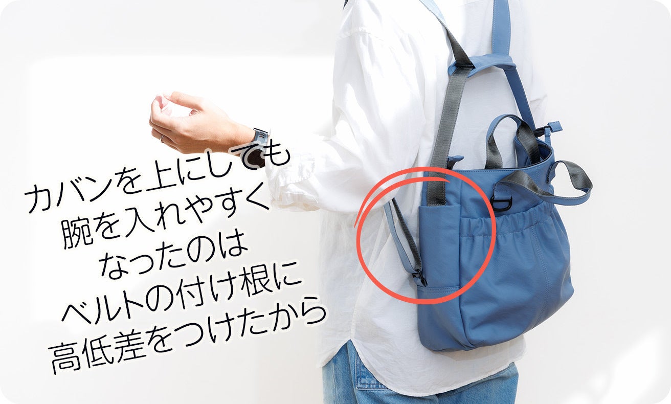 今回は片方のベルトを下に縫い付けたので、カバンを上にしても腕を入れやすく、フィット感もアップ!