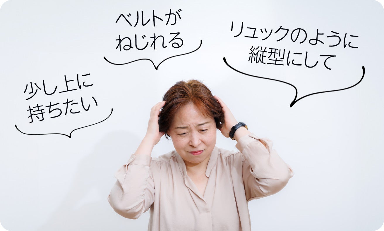 今までのコアルーバッグは、下に来すぎる!との声も多々ありました。それで少し上にしようとすると、今度はこうやって腕を入れにくくなるのです。
