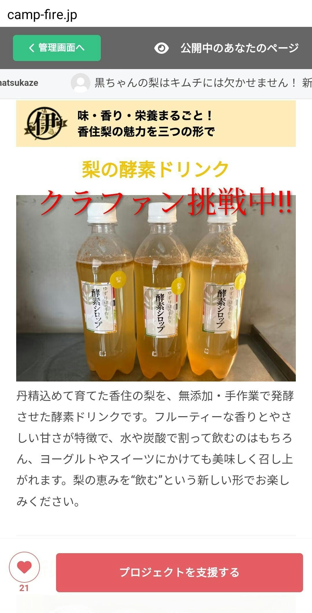 11月28日を持って伊助梨園の出来の悪い子達(梨達)に何とか活躍をと酵素シロップに変身させて活躍させたいとの思いからクラウドファンディングを初めてのやってみました。ドキドキしながらわからないままでしたが、大森さんのご指導の元、酵素シロップを作って頂いた羽曳野のジェラート屋さんの岸本さんとのご縁で目標以上のご支援を頂きました☺これもご支援、応援コメント下さった皆様のおかげです。本当にありがとうございました。返礼品の発送は準備出来次第順次お届けさせて頂きますので少々お待ち下さいませ。更に面白く楽しいこと妄想しながら実現に繋げて人との繋がりを大切に産地を守りながら頑張る所存です☺これも伊助梨園の活動を楽しみにしてくださいね!簡単ですがお礼の投稿とさせて頂きます。