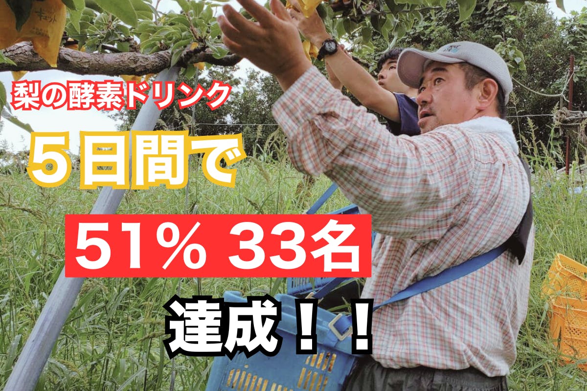 皆さま、こんにちは。「訳あり梨が生まれ変わる!梨の酵素ドリンクを販売したい」プロジェクトを始めて5日が経過しました。これまでに、33名の方から258,800円(目標の51%)もの温かいご支援をいただいております。心より感謝申し上げます。いただいた応援の言葉やリアクションひとつひとつが、大きな励みになっています。とはいえ、ここからが本番です。残り25日間、さらに多くの方にこのプロジェクトを知っていただけるよう、引き続き全力で取り組んでまいります。▼ プロジェクトページはこちらhttps://camp-fire.jp/projects/892468/view?list=watched「面白そう!」「応援したい!」と思っていただけた方は、ぜひページをシェアしていただき応援してくださると嬉しいです。引き続き、どうぞよろしくお願いいたします!