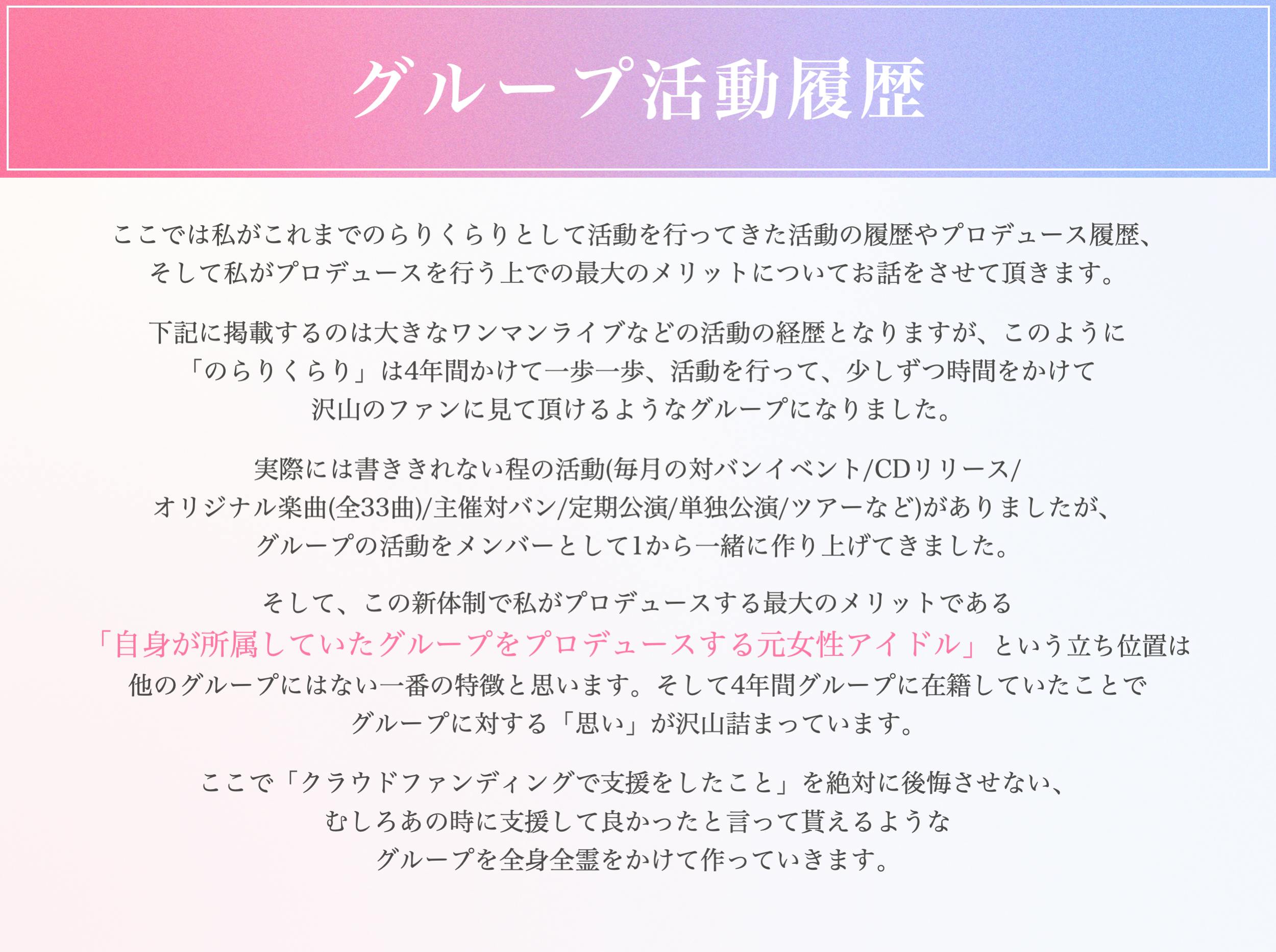 女性アイドルグループ「のらりくらり」は結成4周年を迎え、全メンバーの卒業をもって現体制終了となりました。これまでの歴史を受け継いだ新体制そして「齋藤さくら」プロデュースの元、新グループとして生まれ変わる事が決定!新たな道を紡ぐ第一歩目としてデビューに向けたクラウドファンディングの開催が決定!