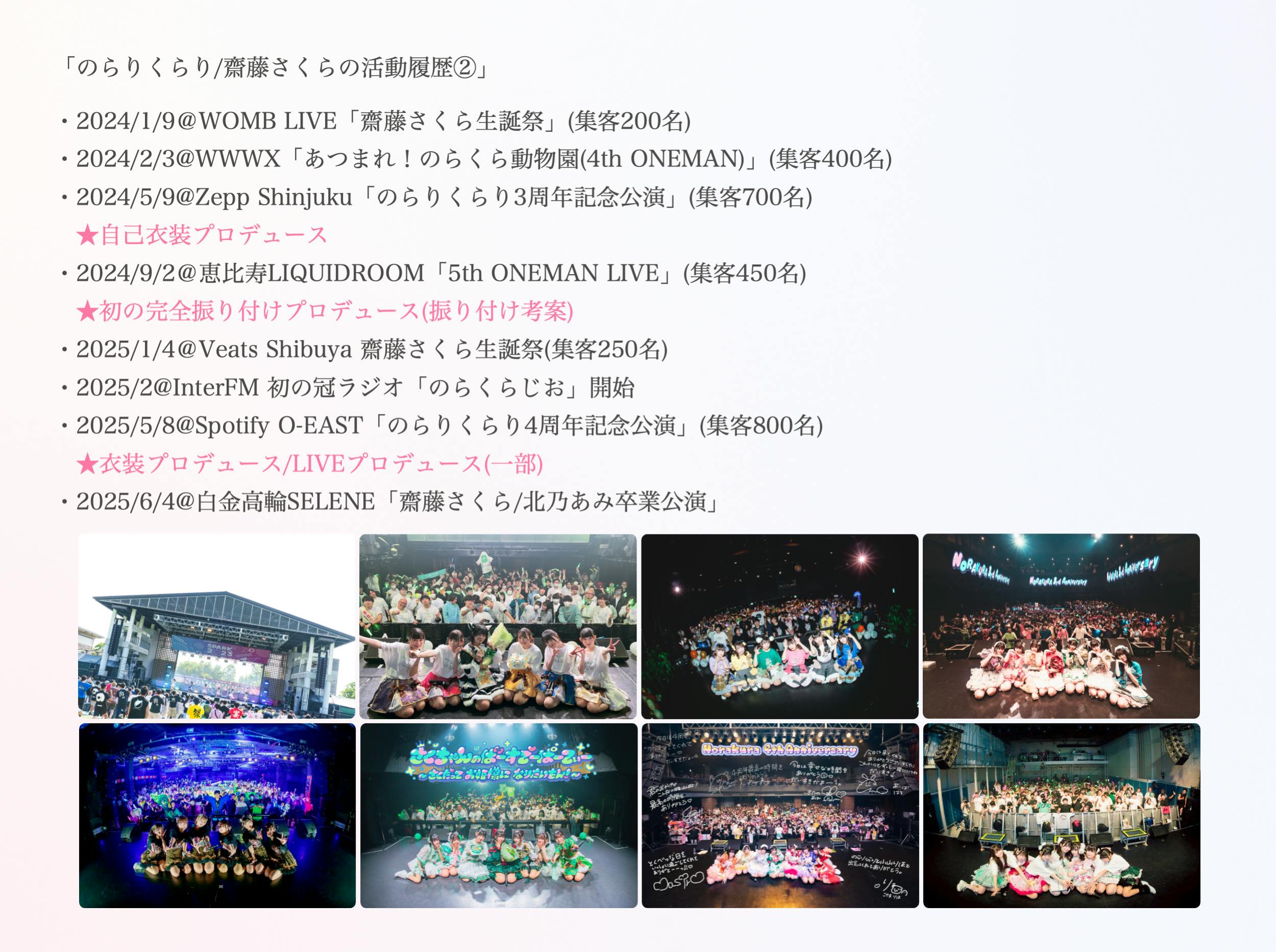 • はじめまして、齋藤さくらです。新体制の準備って、表に出ることが少ないから、「本当に動いてるの…?」って思われているかもしれないし、私がプロデュースしてること、もう忘れてた人もいると思うんです。笑なので、ここで少しずつ近況とか、気持ちとかを置いていけたらと思って、noteを始めました。私は今年の6月まで「のらりくらり」というアイドルグループに所属していました。今は、その“新しいのらりくらり”のプロデュースをしています。今まではステージに立つ側だったけど、これからは「つくる側」として関わっていきます。どうしてそうなったのか。卒業してすぐは「次に進まなきゃ」と思って就職して、ちゃんとした生活をしていました。決まった時間に仕事が始まって終わる日々。安定しているし、整ってるし、たぶん周りから見たら良い生活。でも、同じことの繰り返しがだんだんしんどくなっていきました。通勤中、気づいたらずっとアイドルの動画を見ていて。あ、やっぱり私ここから離れられないなって思ったんです。それと同時に、「のらくら、動いてなくない? 早く見たいんだけど?」って気持ちも強くなっていって。私は思い立ったらすぐ動くタイプなので、そのままプロデューサーさんに連絡して話したら、自然な流れで「じゃあやろうか」と言ってもらえました。そこからは毎日バタバタで、初めてのことばかりだけど、ちゃんと“生きてる”って感じがしています。迷う日もあるけど、それも含めて前に進めているのが嬉しい。アイドルとしての時間で感じた、嬉しかったこと、悔しかったこと、全部いまの自分の中にあって、それがメンバーと向き合う時にちゃんと役に立っているなと思います。メンバーが持っている良さを見つけて、大切にして、ちゃんと届く形にすること。それが今の私の役割です。新しいのらりくらりは、これまでの「ここにしかない空気感」はそのままに、そこに私らしさを少し重ねていくグループです。不器用でもいい。迷う瞬間があってもいい。でも、ちゃんと前に進んでいく姿を見せたい。「続けることには意味がある」その言葉を、一緒に証明したいです。そして、ここから動き出すタイミングを、ずっと待っていてくれた人たちがいること、ちゃんと知っています。最初に「新体制」を信じてくれた人たち。見えない時期でも応援してくれていた人たち。「まだ?」と待ち続けてくれた人たち。その存在を大切にしたいし、その存在が毎日ちゃんと背中を押してくれています。だから私は、焦らずに、でも止まらずに動けています。形になる瞬間は、必ず来ます。そのときはまっすぐに、「待っててくれてありがとう」と伝えたいです。ここでは、オーディションのこととか、ステージ裏の空気とか、気持ちの移り変わりとか、このグループがちゃんと“生きてる”ことが伝わる話をしていきます。ここから始まる0→1を、一緒に育ててもらえたら嬉しいです。読んでくれてありがとう。齋藤さくら もっと見る