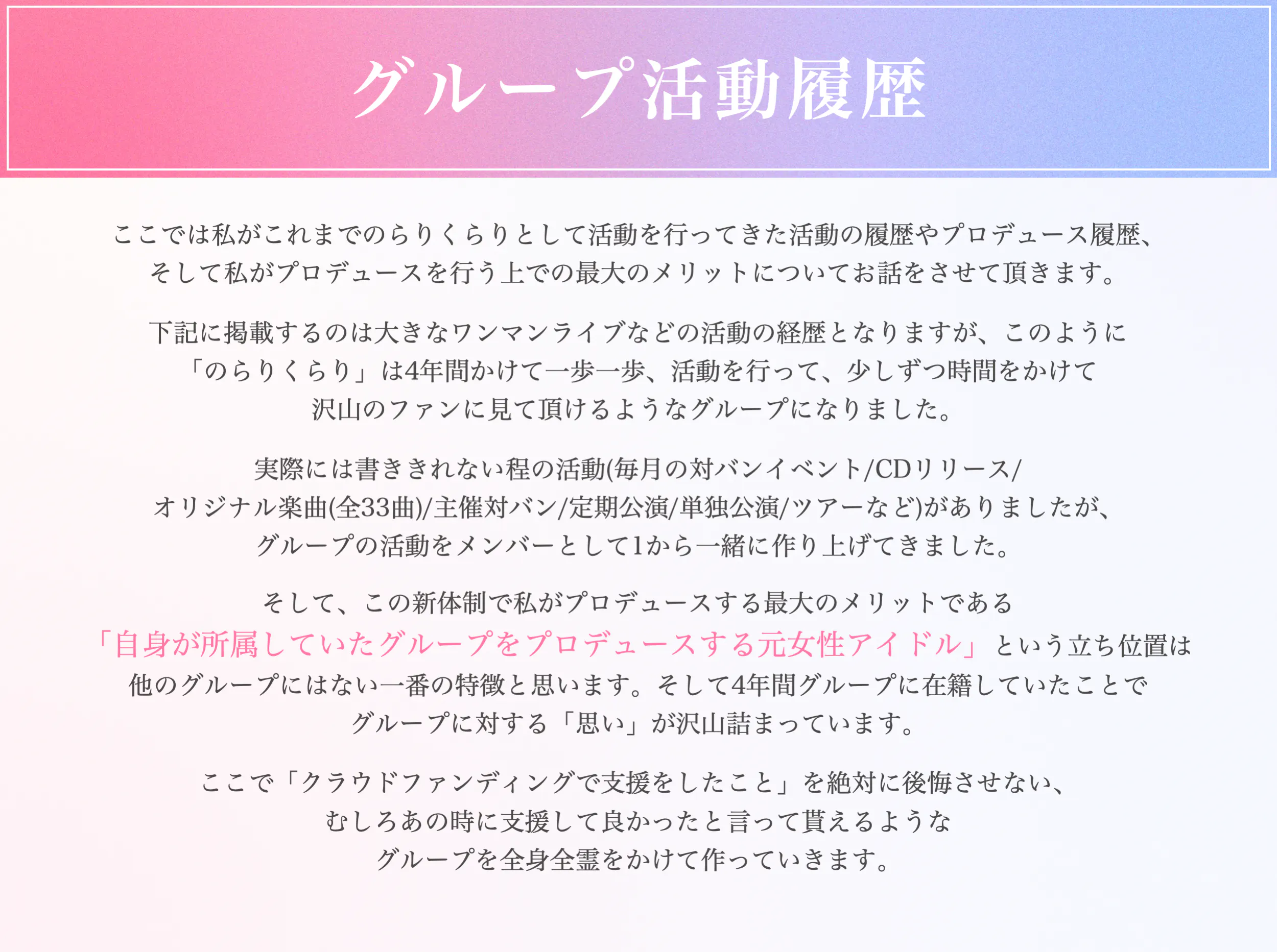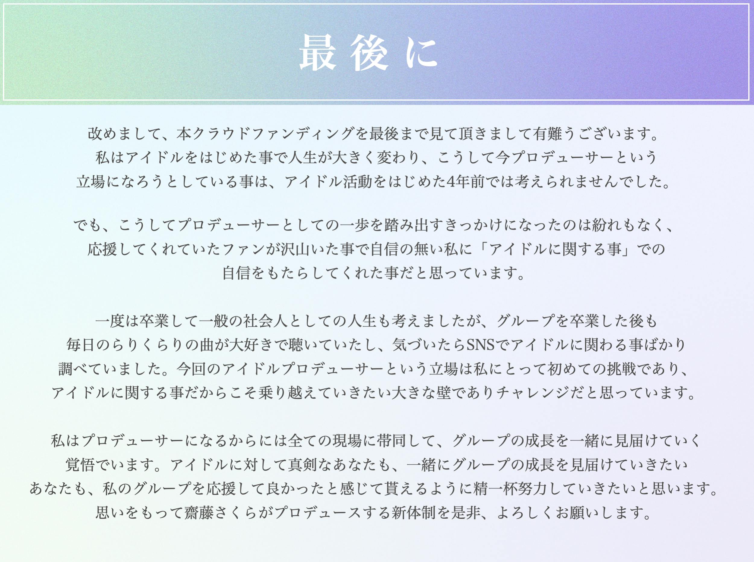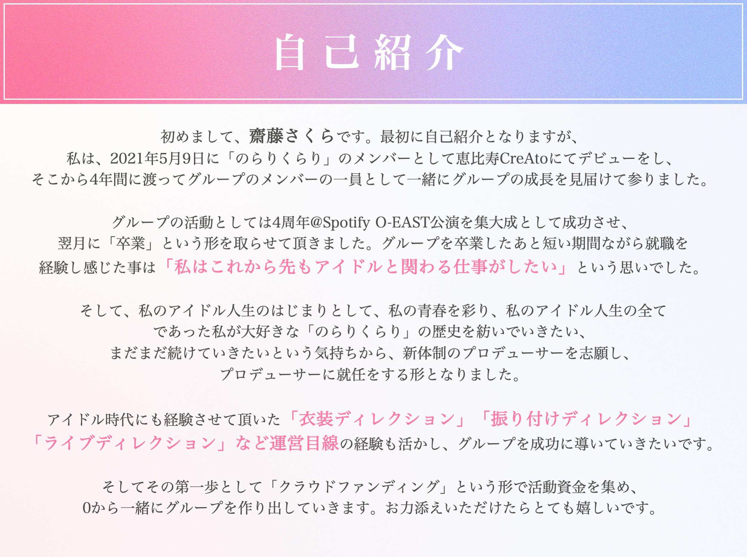 2025/12/08 14:19齋藤さくらです。本日、突然のお知らせに驚いた方も多いかと思います。動画では語りきれない、私なりの考えや、どのように今回の決断に至ったのかも含めて、Produce noteという形で伝えさせてください。Produce note 1と2を既に読んで頂いている方は知っていただけていると思いますが、今回の新体制から私がプロデューサーとしてグループを作り上げていく事となりました。グループに携わりたいと考えてからここまでの3ヶ月間、オーディションも通して、今回大きく決断する事となったため、Produce noteに大切な思いとして記録させて頂くことにします。お知らせの内容にもございましたが、今回新体制をはじめるにあたって「のらりくらり」としての活動は幕を閉じることを決めました。理由は単純ですが、私にとって「のらりくらり」は、4年間のすべてが詰まった大切な物語として完結させたいという思いからです。一緒に歩いてきたメンバーとの時間も、ライブの景色も、あの空気感も、みんなと出会ったあの日も、全部含めて “あの瞬間ののらりくらり” だと思っています。だからこそ、「のらりくらり新体制」として続けるべき事が正しいのかすごく迷い、なんども話し合いを重ね、最終的に「のらりくらり」としての活動は幕を閉じさせることにしました。多くの方に見ていただける環境があるからこそ、新体制に期待してくださっている方も多いはずで、前体制ののらりくらりと私が作っていく新体制はどこかで 違うと言われてしまうかもしれない。そして何より、私自身が大切にしてきたストーリーを曖昧にしたくなかったという気持ちがあります。のらりくらりは、私たちとみんなとの思い出として、ひとつの物語としてきちんと残しておきたい。その想いから、グループとしては一度区切りをつける選択をしました。幕を閉じるという書き方をしましたが、でも、ここで終わりではありません。新しく始まるのは全くの別物ではなく、のらりくらりの心をしっかり受け継いだ、新しいグループにしたいと考えています。今までののらりくらりは、「何もしたくない、ダラダラしていたい、自分のペースでしか進めない、でも、生きなきゃ、ゆるりふわりと、のらりくらり」そんな自分自身の気持ちの投影でした。新グループは視点を変えて、そんなのらりくらりとしてこれまで活動してきたからこそ叶えられる、実現できるコンセプトにしようと考え“のらりくらりなあなたを応援する”という事を新体制のグループコンセプトにします。どんなペースでも大丈夫だよ、と寄り添えるような存在。焦りや不安を抱える人が、すっと呼吸できるような空気を持った、たくさんの人に元気や勇気をあたえられるような存在。もっというと毎日の支えになるような、何か今日嫌な事があった、今日ダメダメだった、そんな自分でいいのかなと落ち込んだ時に私たちを見にきてくれたら、元気を貰えて、自分はこのままでもいいんだって思ってもらえるような、そういうグループにしたいと思っています。新しい形になっても、私が、皆が大切にしてきたのらりくらりらしさは静かに息をし続け、これからの物語へ繋がっていきます。そして、何より伝えたいことはのらりくらりが残してくれた曲たちは、本当に自慢できるくらい素敵で、大切な宝物です。だからこそ、のらりくらりを終了させるからといって全てを手放すのではなく、これからも大切にするべきものだと私は考えていて、ちゃんと残していきたいと思っています。多くの人の心に届け続けたい楽曲たちであると思っているし、それはグループ結成時から歌い続けてきた私がプロデューサーになるからこそ、より叶えられることとも思っています。曲が持っている想いや空気感は、新しいグループの中でもしっかり生きていきます。その音楽たちに、また新しい出会いが訪れるように。改めてのらりくらりを終了させると伝えましたが、新しいグループは完全なる0からの一歩ではなく、これまで私たちが守ってきた大切なものを抱えたまま、前へ進むための一歩です。これまでののらりくらりを愛してくれたみんなにも、そしてこれから出会うあなたにも、ちゃんと届くように、丁寧に作っていきます。ここから、新たなグループとしての発表ごとが沢山出てきます。自分が好きだったのらりくらりは終わってしまったと悲しい気持ちになってしまう方もいるかもしれませんが、そんな時はこのノートを読んで欲しいし、私がしっかり思いを紡いで引き継いでいくということを知っていて貰えたら嬉しいなと思います。長文にはなりましたが、ここからはじまる新グループ、大切な思いと共に成長させていくので、是非見に来ていただけたら嬉しいです。応援、何卒よろしくお願いします。 もっと見る