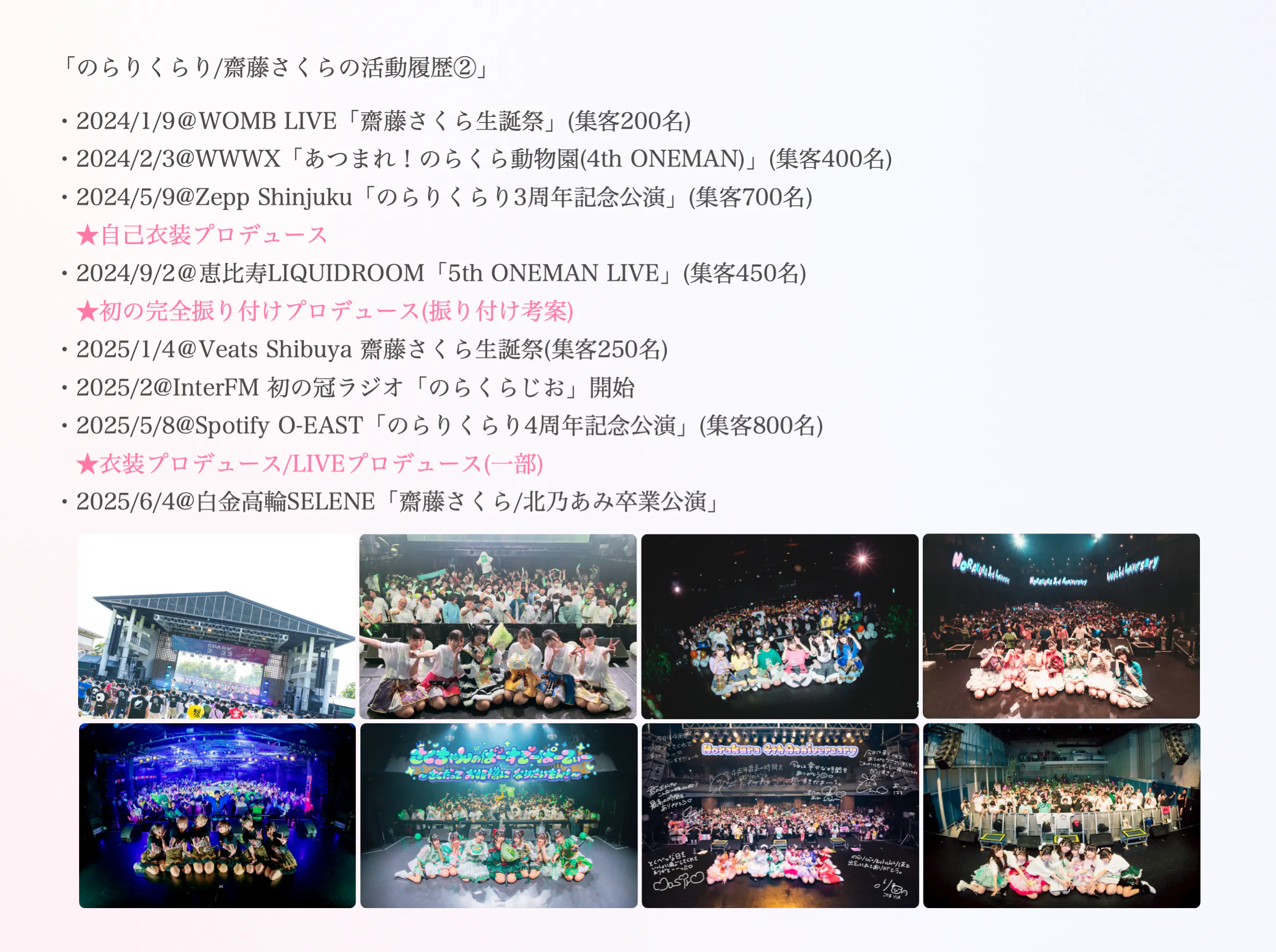 2025/12/03 23:57はじめまして、齋藤さくらです。新体制の準備って、表に出ることが少ないから、「本当に動いてるの…?」って思われているかもしれないし、私がプロデュースしてること、もう忘れてた人もいると思うんです。笑なので、ここで少しずつ近況とか、気持ちとかを置いていけたらと思って、noteを始めました。私は今年の6月まで「のらりくらり」というアイドルグループに所属していました。今は、その“新しいのらりくらり”のプロデュースをしています。今まではステージに立つ側だったけど、これからは「つくる側」として関わっていきます。どうしてそうなったのか。卒業してすぐは「次に進まなきゃ」と思って就職して、ちゃんとした生活をしていました。決まった時間に仕事が始まって終わる日々。安定しているし、整ってるし、たぶん周りから見たら良い生活。でも、同じことの繰り返しがだんだんしんどくなっていきました。通勤中、気づいたらずっとアイドルの動画を見ていて。あ、やっぱり私ここから離れられないなって思ったんです。それと同時に、「のらくら、動いてなくない? 早く見たいんだけど?」って気持ちも強くなっていって。私は思い立ったらすぐ動くタイプなので、そのままプロデューサーさんに連絡して話したら、自然な流れで「じゃあやろうか」と言ってもらえました。そこからは毎日バタバタで、初めてのことばかりだけど、ちゃんと“生きてる”って感じがしています。迷う日もあるけど、それも含めて前に進めているのが嬉しい。アイドルとしての時間で感じた、嬉しかったこと、悔しかったこと、全部いまの自分の中にあって、それがメンバーと向き合う時にちゃんと役に立っているなと思います。メンバーが持っている良さを見つけて、大切にして、ちゃんと届く形にすること。それが今の私の役割です。新しいのらりくらりは、これまでの「ここにしかない空気感」はそのままに、そこに私らしさを少し重ねていくグループです。不器用でもいい。迷う瞬間があってもいい。でも、ちゃんと前に進んでいく姿を見せたい。「続けることには意味がある」その言葉を、一緒に証明したいです。そして、ここから動き出すタイミングを、ずっと待っていてくれた人たちがいること、ちゃんと知っています。最初に「新体制」を信じてくれた人たち。見えない時期でも応援してくれていた人たち。「まだ?」と待ち続けてくれた人たち。その存在を大切にしたいし、その存在が毎日ちゃんと背中を押してくれています。だから私は、焦らずに、でも止まらずに動けています。形になる瞬間は、必ず来ます。そのときはまっすぐに、「待っててくれてありがとう」と伝えたいです。ここでは、オーディションのこととか、ステージ裏の空気とか、気持ちの移り変わりとか、このグループがちゃんと“生きてる”ことが伝わる話をしていきます。ここから始まる0→1を、一緒に育ててもらえたら嬉しいです。読んでくれてありがとう。齋藤さくら もっと見る