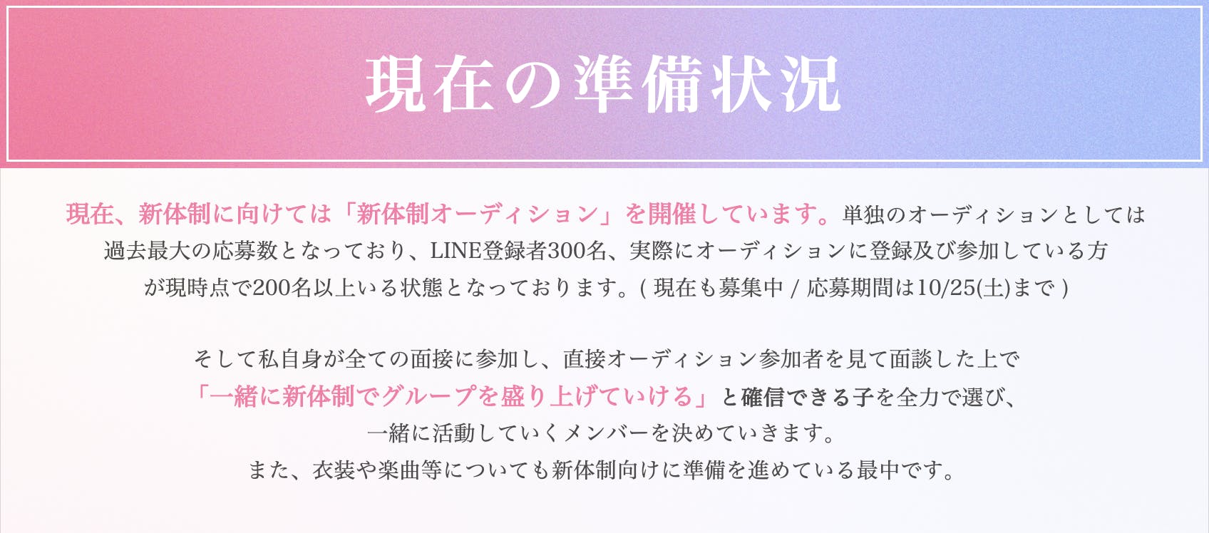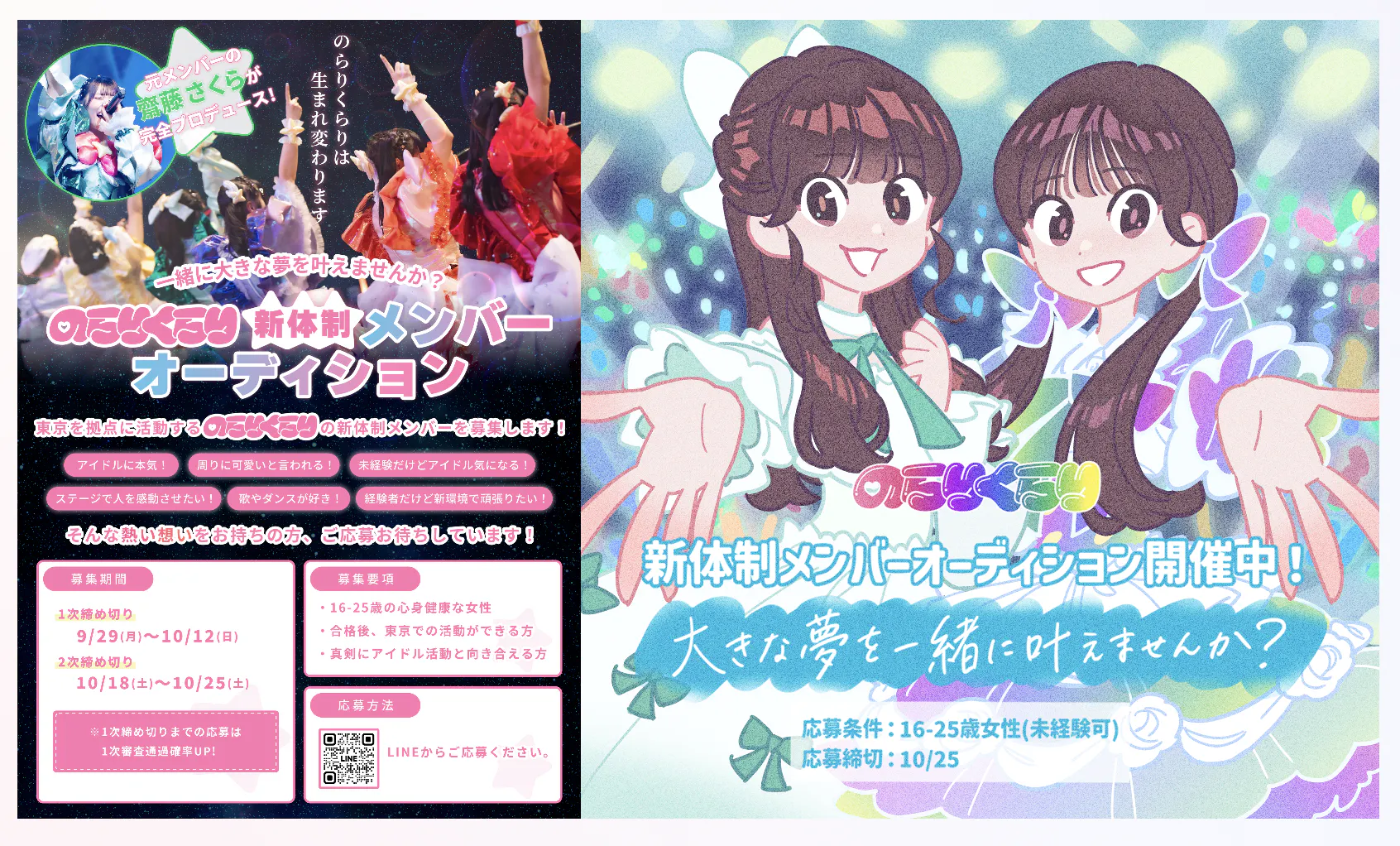 2025/12/05 00:22今回の新体制オーディションには、なんと300名以上の方が応募してくださいました。まずは、応募してくださったすべての皆さま、本当にありがとうございました。ここでは、どのような審査を行い、どんな流れでメンバーを決定したのかを少し詳しくお伝えします。⸻書類選考:約300名参加最初の書類選考では、プロフィール、志望動機、活動歴、写真などを拝見し、グループの方向性や今後の活動の中で活躍できる可能性があるかを判断しました。できるだけ多くの方に直接お会いしたかったため、条件に当てはまり、少しでも魅力や可能性を感じた方は積極的に通過とさせていただきました。通過者は 約150名 でした。⸻1次面談審査:約150名参加1次面談では、応募者一人ひとりと実際にお話をし、人柄・意欲・考え方・コミュニケーション力を中心に見させていただきました。・どんなアイドルになりたいか・グループ活動への理解・これまでの経験・夢に向かう姿勢や熱量短い時間ではありましたが、その言葉や表情から伝わってくる本気を感じることができました。ここで通過となったのは 約50名 です。⸻2次ダンス・歌審査:約50名参加2次審査では、実際のステージに必要な ダンス と 歌 の審査を行いました。・振り覚えの速さ・リズム感・表現力や魅せ方・声の安定感や個性・パフォーマンスへの向き合い方技術の高さだけでなく、この子と一緒にステージを作りたいと思えるかどうかを大切に見させていただきました。この審査を通過したのは 15名 です。⸻3次グループパフォーマンス審査:15名参加3次審査では、複数名による グループパフォーマンス を実施しました。ここでは、個人のスキル以上に「チームの中でどう動けるか」「どんな空気を作るか」という部分を評価しました。・協調性・チームワーク・ステージでの存在感・グループに入ったときのイメージ・周囲をどう活かすか、どう支えるか一人ひとりの個性が際立つ中で、メンバーとしての姿が見えはじめる、とても大切な審査でした。ここを通過したのは 10名 です。⸻最終面談審査:10名参加最後の審査となった最終面談では、それぞれの覚悟や価値観を深くお聞きしました。・活動への本気度・継続していくための覚悟・スケジュール管理や生活リズム・のらりくらりとして何を届けたいか・自分の夢と、このグループの未来をどう重ねていくかここでは、技術やその日のパフォーマンスだけでは判断できない、人としての強さや共に戦えるかどうかを重視しました。この審査を通して、ついに新体制メンバーが決定しました。最後に今回のオーディションは、私たちにとっても、応募してくれたみなさんにとっても、たくさんの想いがつまった時間でした。どの審査も、本当に簡単ではありませんでした。素敵な子が多すぎて、選ぶのが苦しくなることもありました。できることならもっと多くの子と一緒に進みたい気持ちも正直ありました。でもその中で、「この子たちとなら一緒に進んでいきたい」そう思えるメンバーに出会えたことが、とても嬉しいです。今回最後まで残ってくれた子たちは、歌やダンスのうまさだけじゃなくて、言葉や表情から伝わる気持ちが強くて、このグループを一緒につくりたいという想いがしっかり感じられました。応募してくれたみなさんの気持ちも努力も、ちゃんと届いています。そのうえで選ばれたメンバーと、これからしっかり前に進んでいきます。このオーディションに関わってくれたすべての方へ、心からありがとう。新体制はまだ始まったばかりですが、ここからもっと良いグループにしていけるように、みんなで頑張っていきます。これからの私たちを、どうか見守っていてください。 もっと見る