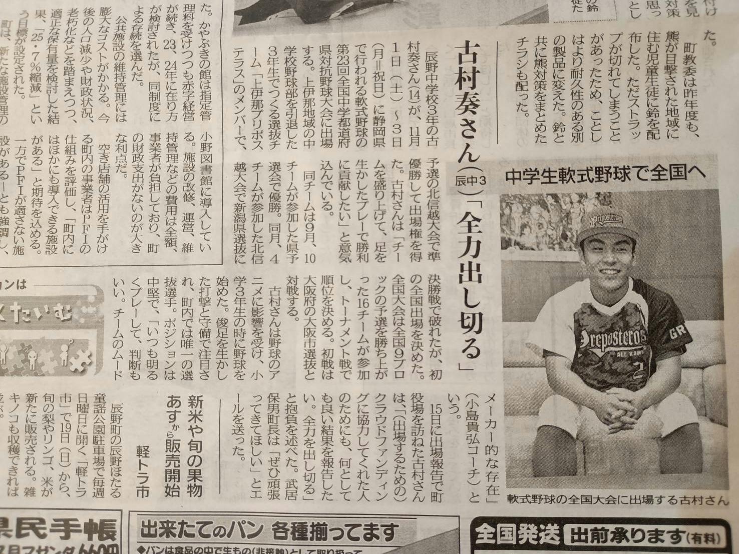 先日の辰野町への表敬訪問の様子が古村くんの感謝のコメント付きで新聞に掲載されました。