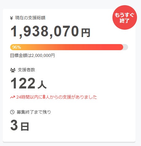 皆さまのお力添えにより、支援者数122名・本プロジェクトの現在の目標達成率はなんと...