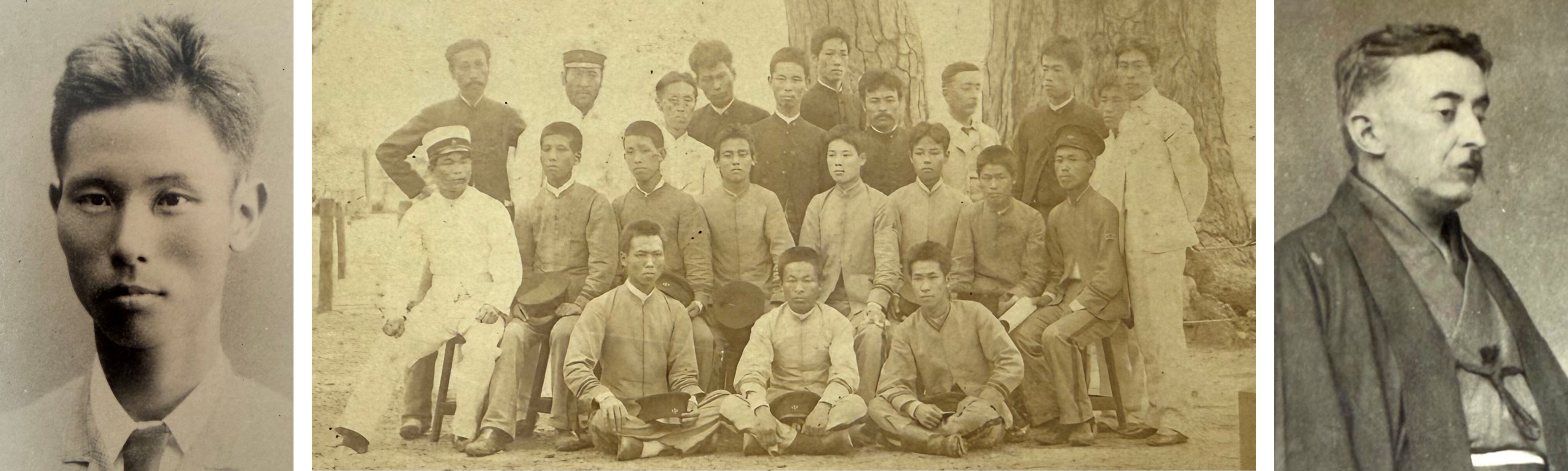 左:西田千太郎、中央:島根県尋常中学校卒業記念写真、右:小泉八雲(いずれも西田家所蔵)