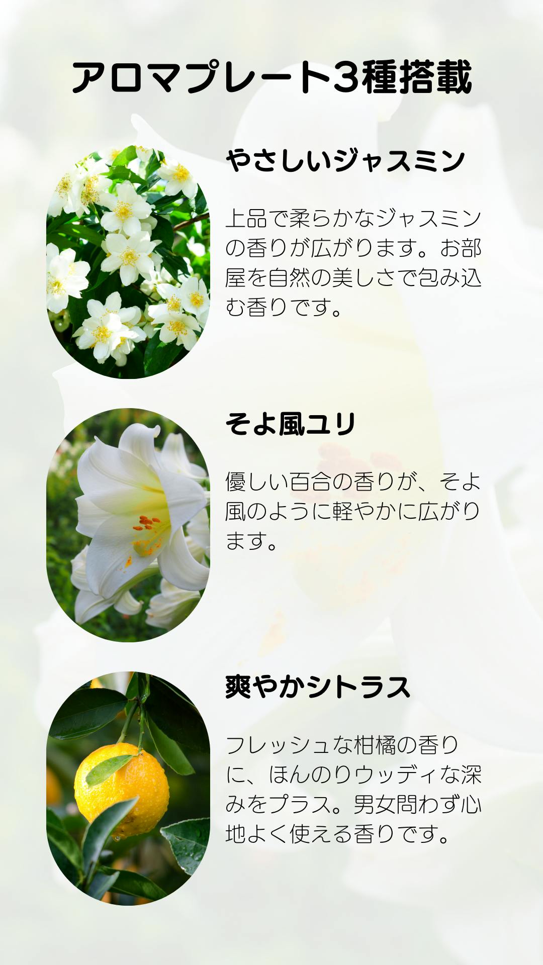 使い方はとても簡単で、アロマプレートを本体に差し込むだけ。煙や液だれの心配もなく、安心してご使用いただけます。セットには、シトラス、ユリ、ジャスミンの3種類の香りをご用意しました。それぞれが心を癒す上品な香りで、性別や年齢を問わず、どなたにも楽しんでいただける汎用性の高さが魅力です。