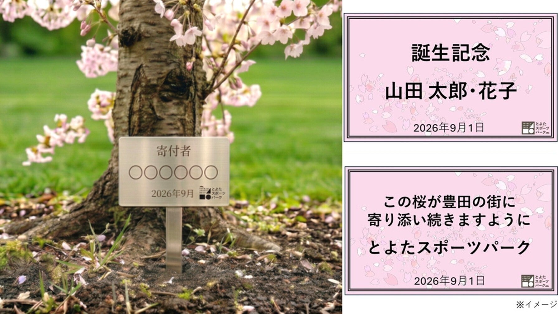 とよたスポーツパーク内に植えられる桜の苗木に、お名前やメッセージを添えていただけます。たとえばお子さまやお孫様のお名前をつけた桜が、年月とともに成長していく姿を見守りながら、ご家族の思い出を重ねていく。そんな特別な存在になるはずです。人生の節目や大切な記念として、未来へと続く一本を植えてみませんか。