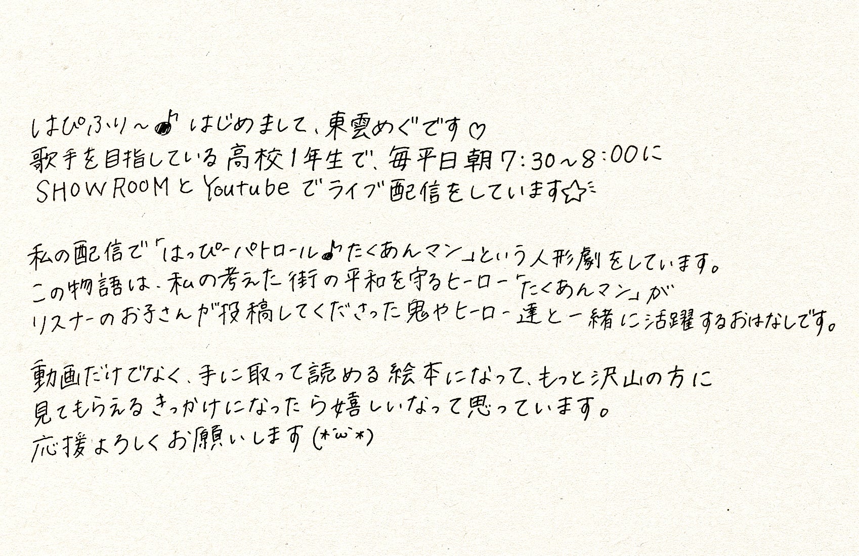「はっぴーパトロール♪ たくあんマン」はYouTubeで配信中のめぐちゃんの番組にお子さんたちの描いたヒーローや鬼の絵が登場する物語です。このとてもステキな体験をもっともっとお子さんやその保護者の方に知っていただきたいということから誰でも手に取りやすい絵本化のプロジェクトをはじめました。