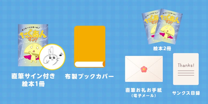 この絵本を全国の幼稚園、保育園、小学校、図書館にできるかぎり無料でお届けし、たくさんのお子さんに「たくあんマン」を知ってもらって作品を創る楽しさを広げていくことを夢見ています。