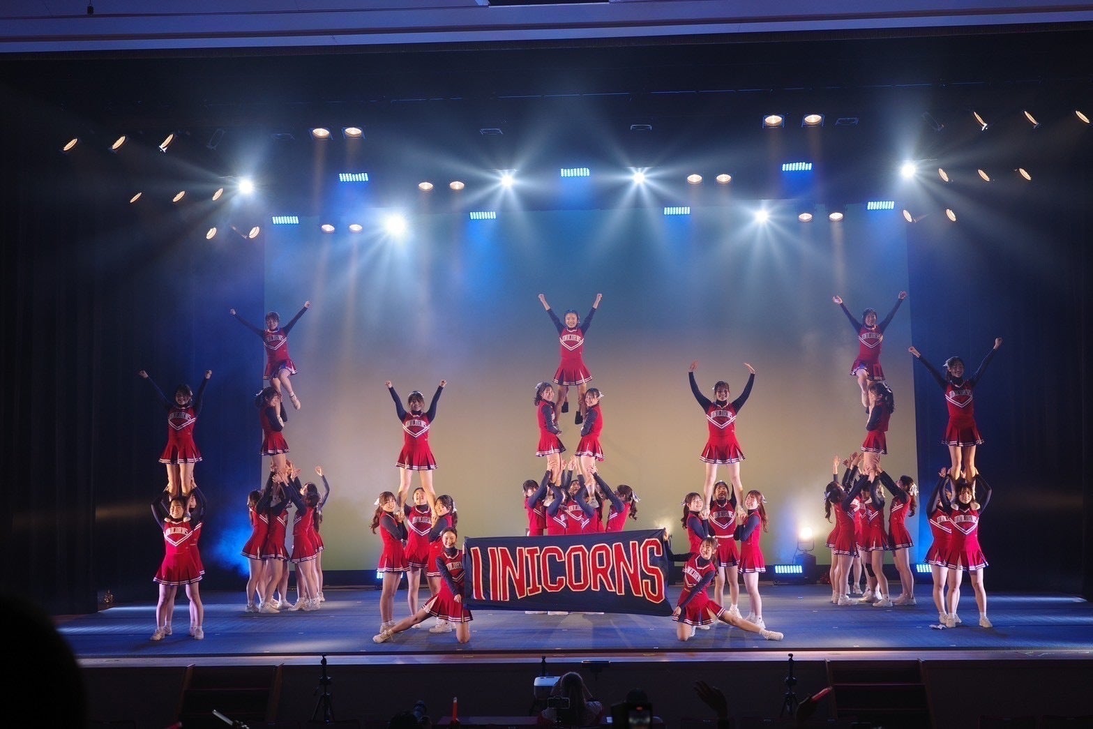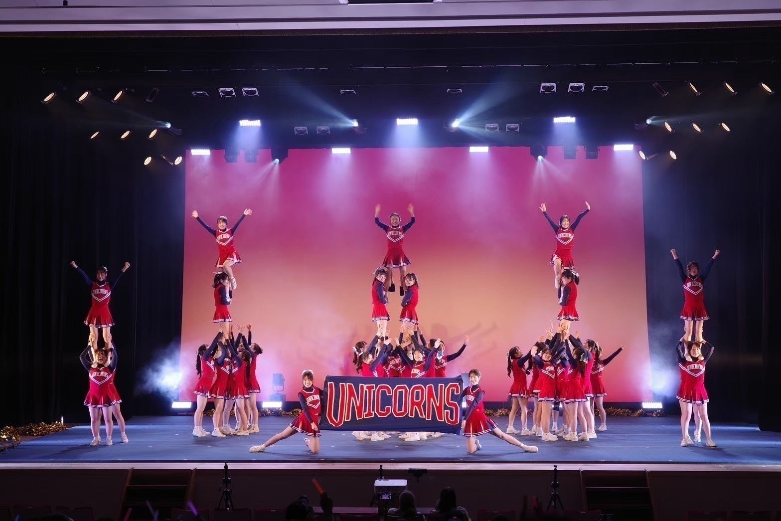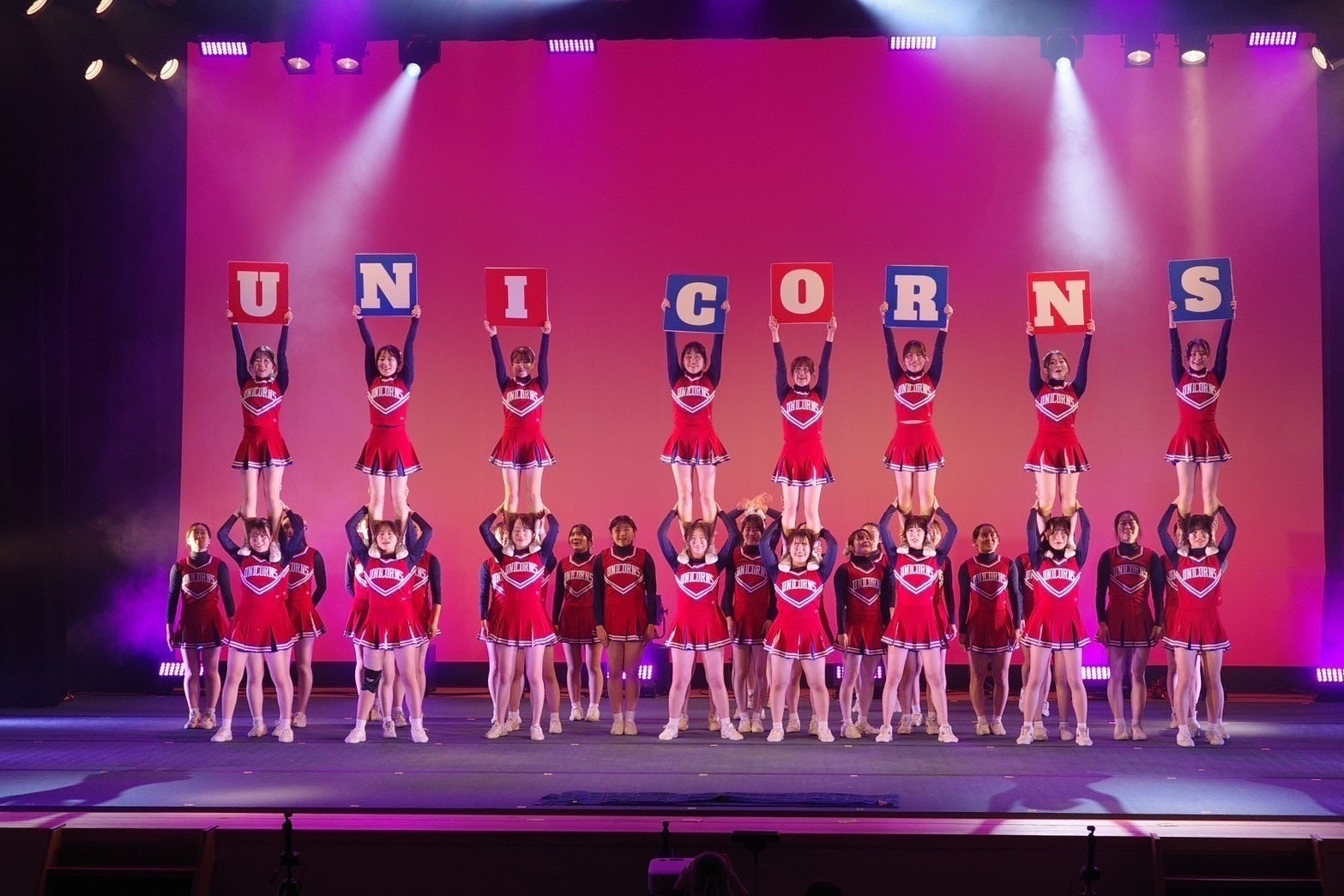競技チアリーディングとは、「いかに観客を魅了し惹きつけることができるか」を競うスポーツです。 演技時間は2分30秒。 この短い時間に練習で培った技術と熱い想いをかけます。 チアリーディングには応援チアリーディングと、そこから発展した競技チアリーディングがありますが、UNICORNSは主に後者の競技チアリーディング部門で活動しています。
