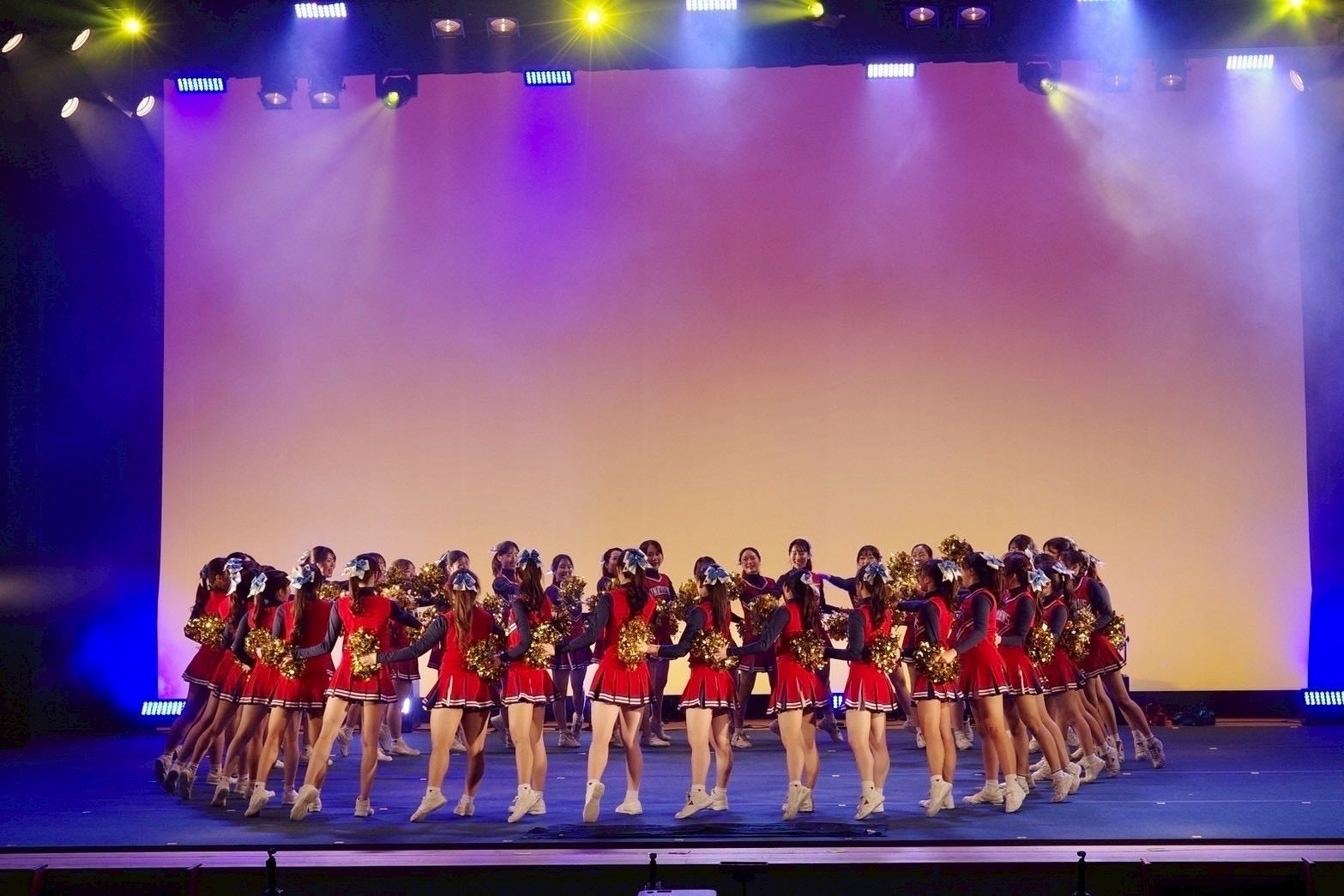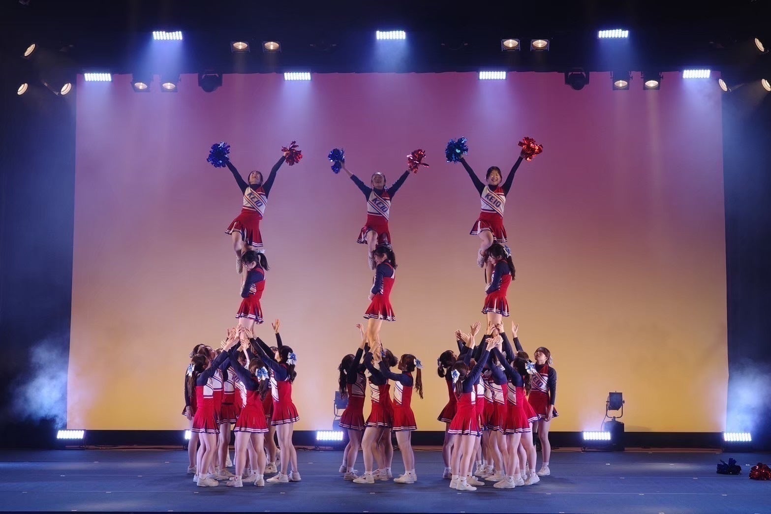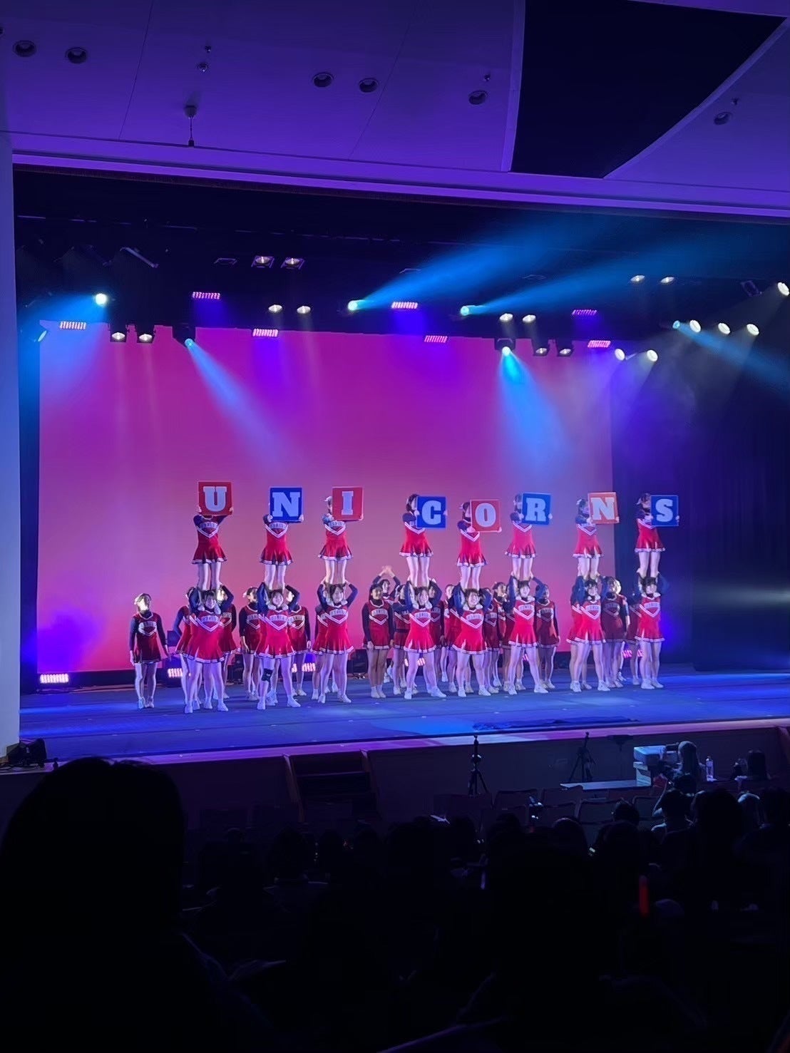 競技チアリーディングとは、「いかに観客を魅了し惹きつけることができるか」を競うスポーツです。 演技時間は2分30秒。 この短い時間に練習で培った技術と熱い想いをかけます。 チアリーディングには応援チアリーディングと、そこから発展した競技チアリーディングがありますが、UNICORNSは主に後者の競技チアリーディング部門で活動しています。