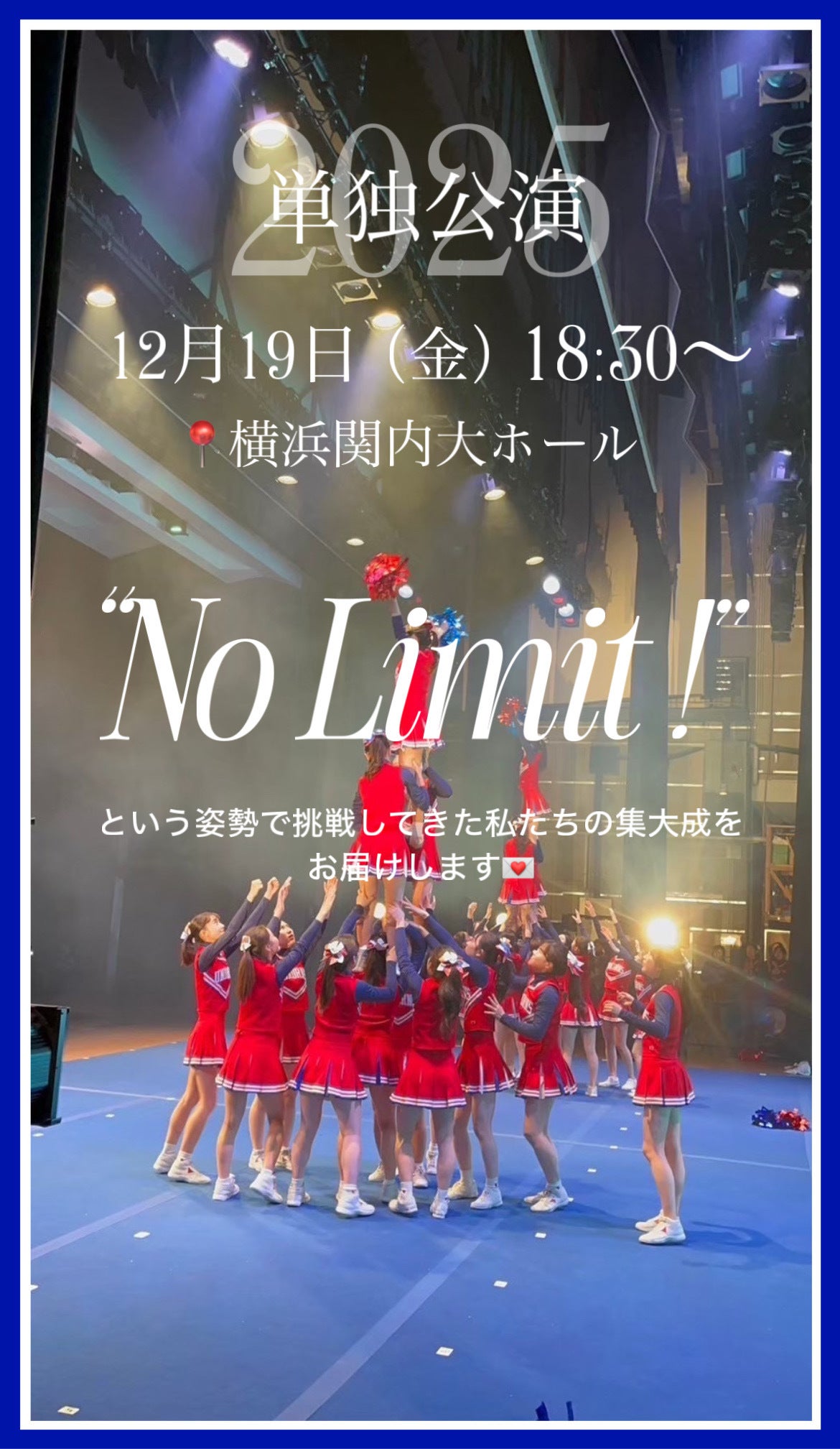 今年度のスローガン「No Limit!」には、限界とは自分たちで決めるものではなく、心の在り方次第で進む道は変わっていくーーそんな競技チアからの学びを込めました。どこにいても私たちは「No Limit!」である。その思いを、この引退公演で体現したいと考えています。単独公演では、これまで取り組んできた練習や大会への努力の集大成を披露するとともに、支えてくださった皆様への感謝を伝えたいと思います。「No Limit!」という姿勢で挑戦を続けてきた1年間の成果を、多くの方々にお届けできれば幸いです。