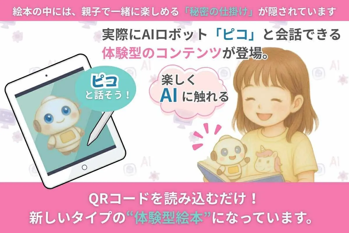 物語の舞台は、夢の中にある“AIひみつきち”。ママとゆづがAIロボットのピコと出会い、「AIも間違えることがあるんだよ(ハルシネーション)」というテーマを通して、“正しく考える力”や“AIとのつき合い方”をやさしく学んでいくお話です。