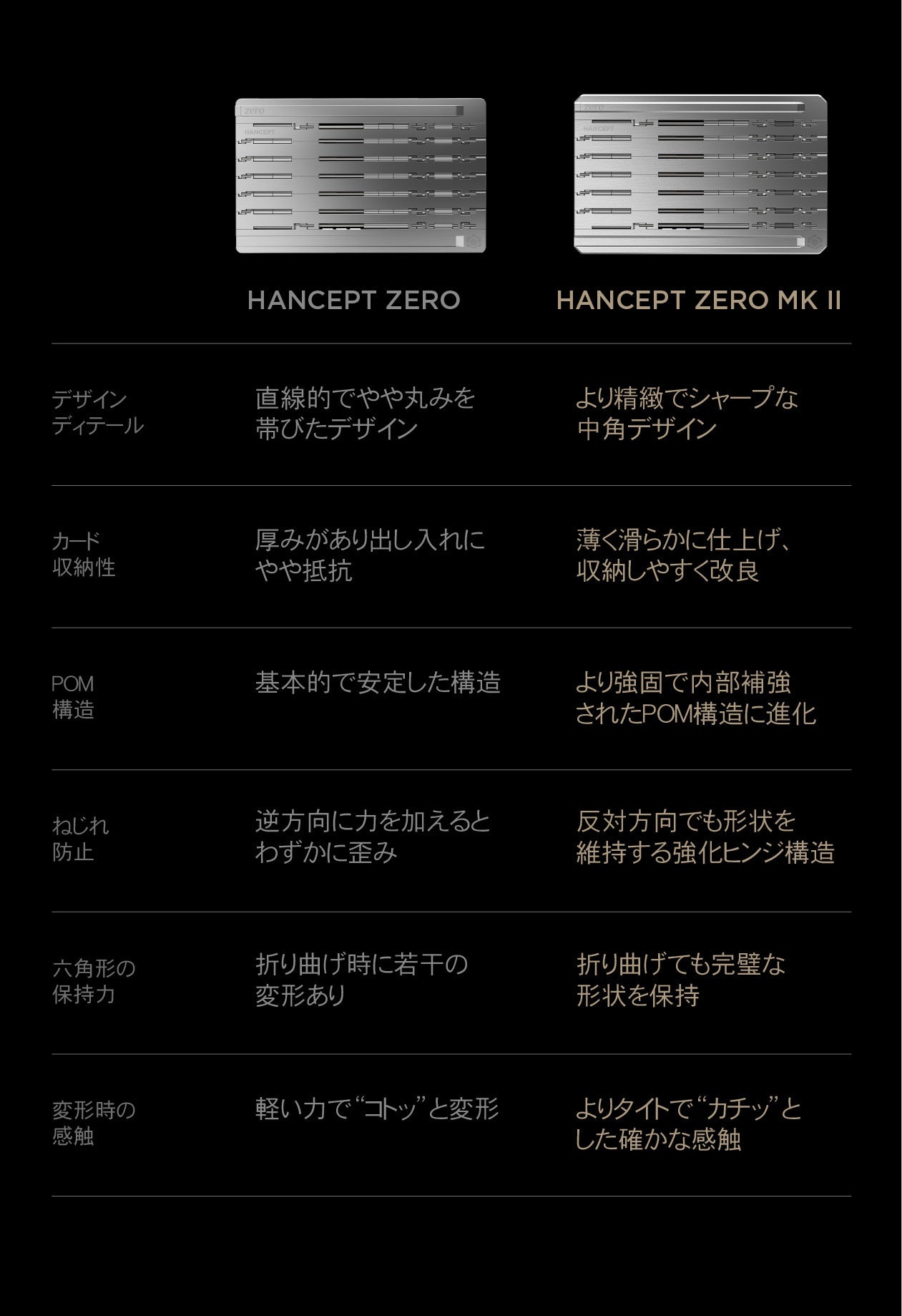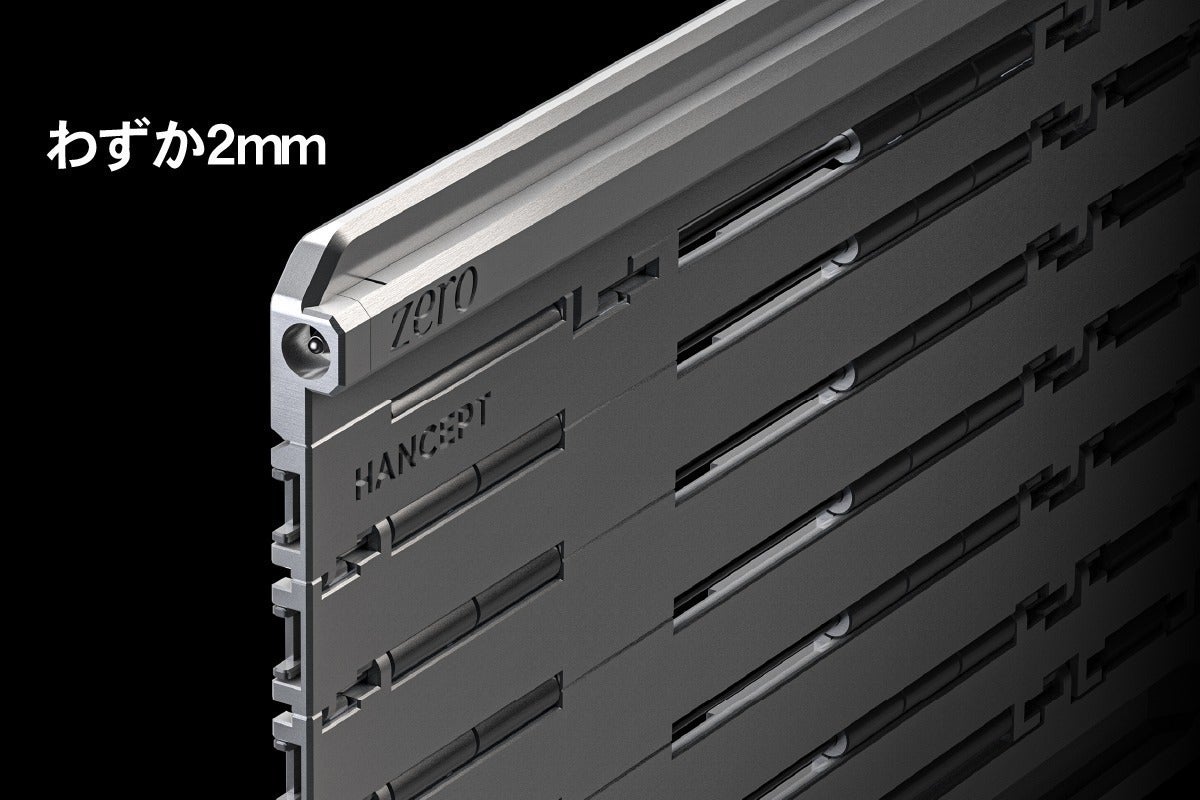 カードサイズの完成形を目指したHANCEPT ZERO MKⅡは、財布やポケットにも自然に収まるよう、厚みまでも緻密に計算し設計されています。