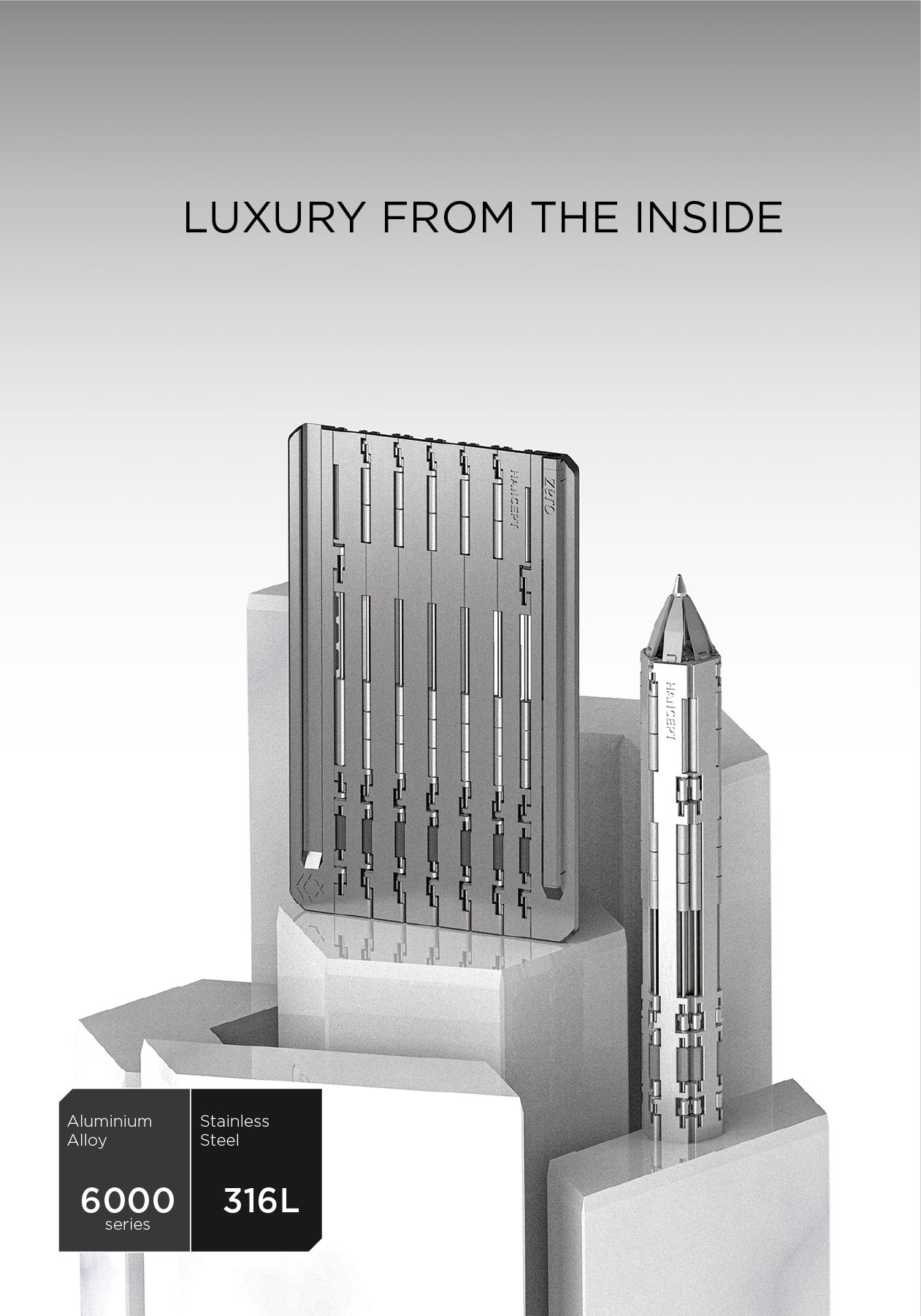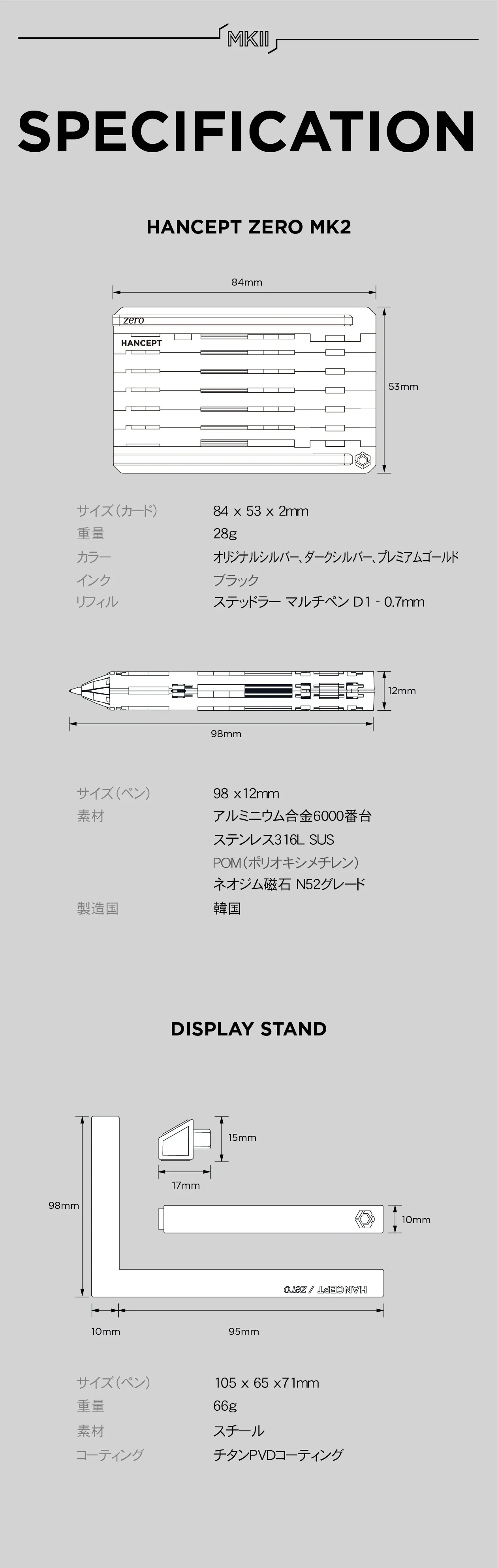 HANCEPT ZERO MKⅡは、316Lステンレススチール、6000番台アルミニウム合金、高強度POM、そして強力なN52ネオジム磁石など、耐久性と質感に優れた素材で構成されています。