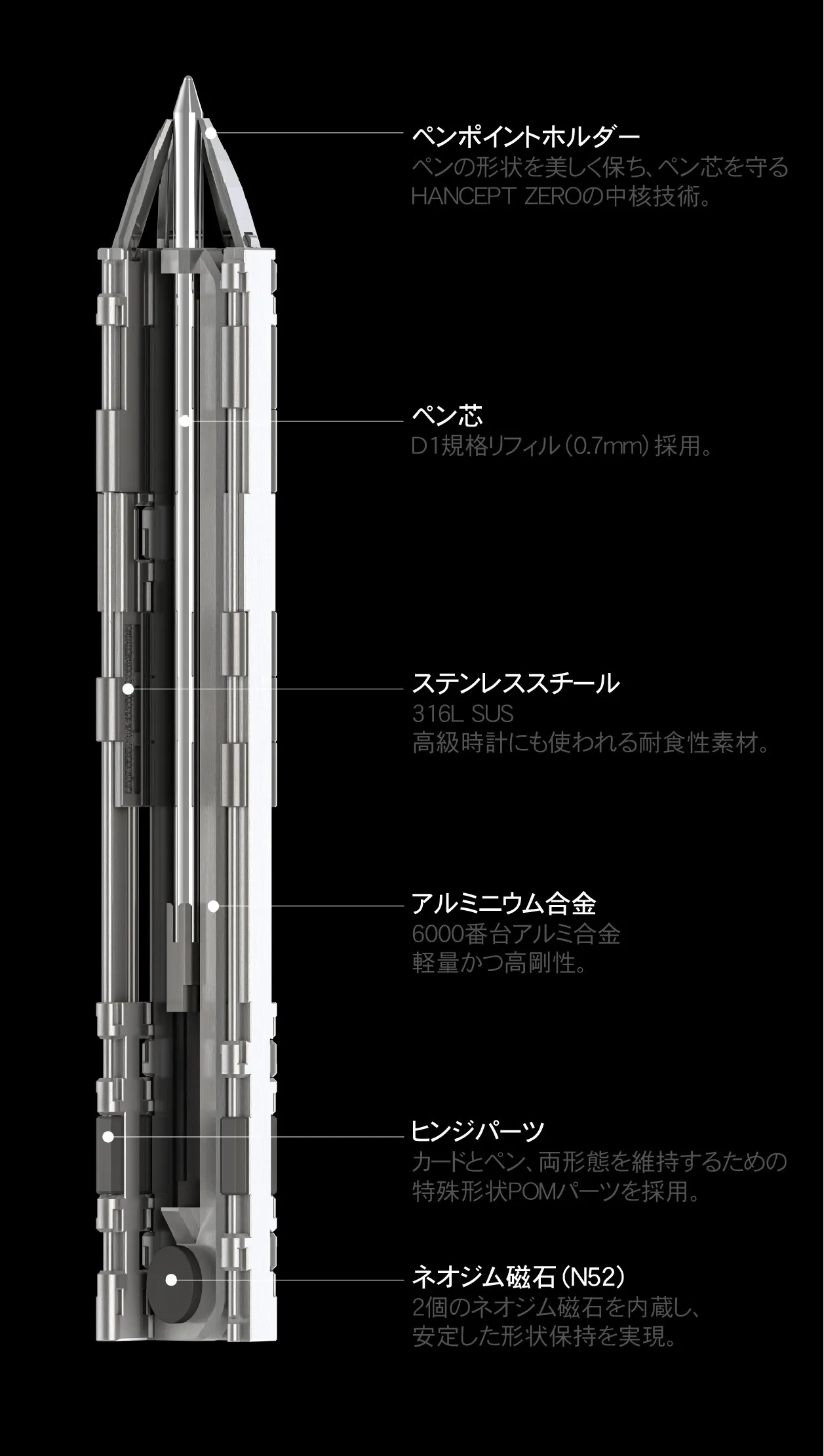 アルミ合金、ステンレススチール、マグネティック素材を採用し、リフィルから外装・内部構造に至るまで、すべてが金属製で構成されています。