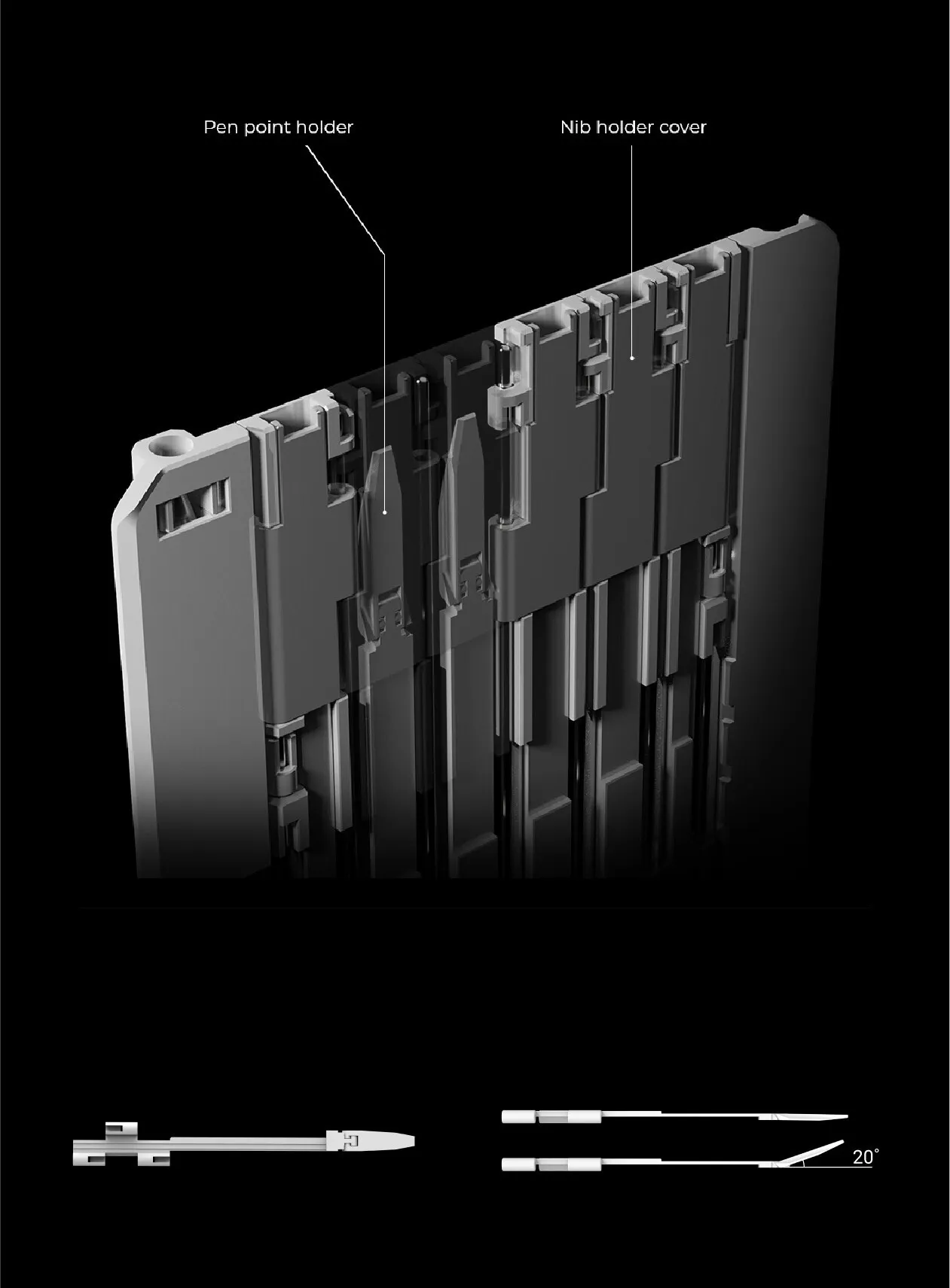 それぞれの部品は、明確な役割を持って緻密に設計され、ペン先を安定して包み込み、保護するためのコアテクノロジーを形づくっています。