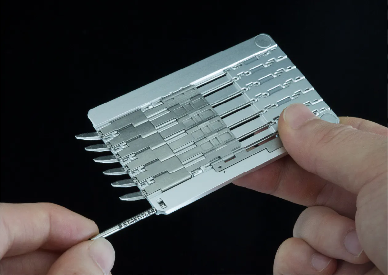 数十もの金属パーツが有機的に組み合わされた複雑な構造でありながら、ペンリフィルを除くすべての部品をわずか2mmの厚さの中に収めました。