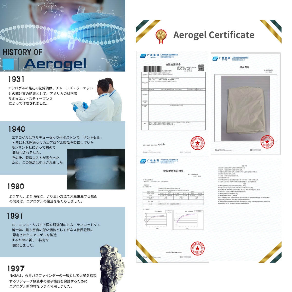 NASAが宇宙服の断熱材として採用したことでも知られ、現在では航空・宇宙産業はもちろん、建築、エネルギー、アウトドア用品など、次世代素材として世界中で注目されています。