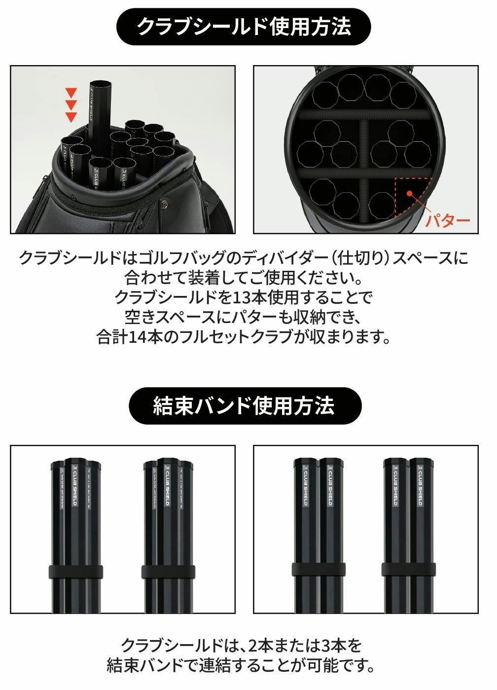 A.はい、クラブシールドはほとんどのゴルフバッグで使用可能です。バッグの種類に合わせて、本数を調整してお使いいただけます。