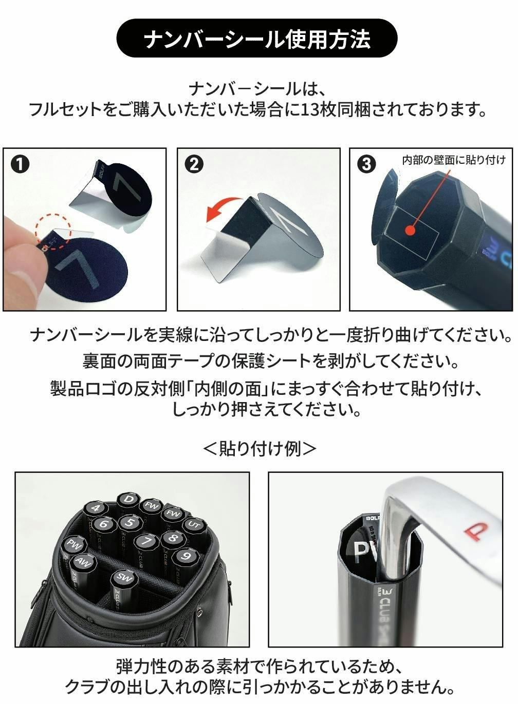 付属のメタル製ナンバーシールで、クラブを常に定位置に戻せる構造なので、1本でも欠けていればすぐに気づけます。置き忘れ・入れ忘れの防止に効果的で、プレー中の安心感が格段に上がります。