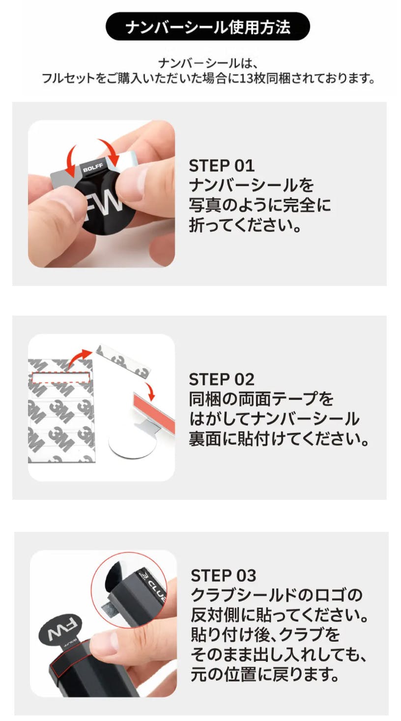 2026/03/10 17:22クラブシールドをご支援いただいた皆さまへこの度はクラブシールドをお受け取りいただきありがとうございます。ナンバーシールの取り付け方法についてご案内いたします。今回お届けしているナンバーシールは、より貼りやすく使用しやすい仕様へ改良されたタイプとなっております。しかし、同梱されている日本語説明書およびプロジェクトページの説明には、改良前の取り付け方法が掲載されたままとなっており、分かりづらい内容となってしまっておりました。ご不便をおかけしてしまい誠に申し訳ございません。現在の正しい取り付け方法を、以下の画像にてご案内いたします。また、ナンバーシールはフルセットの場合、13枚同梱されています。もし不足している場合やご不明な点がございましたら、メッセージにてお気軽にご連絡ください。この度は分かりづらいご案内となってしまい誠に申し訳ございません。他にもご不明な点等ございましたら、下記までお気軽にお問合せください。▼お問合せ先hello@4clover-co.jp引き続きクラブシールドをどうぞよろしくお願いいたします。 もっと見る
