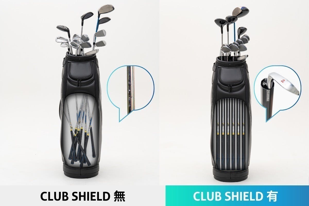 「Club Shield(クラブシールド)」は、クラブを1本ずつ独立収納できるうえ、約85cmのロング設計でグリップからシャフト先端までを個別に保護します。そのため、バッグの中でクラブ同士がこすれたりぶつかったりせず、摩擦や傷つきをしっかり防げます。